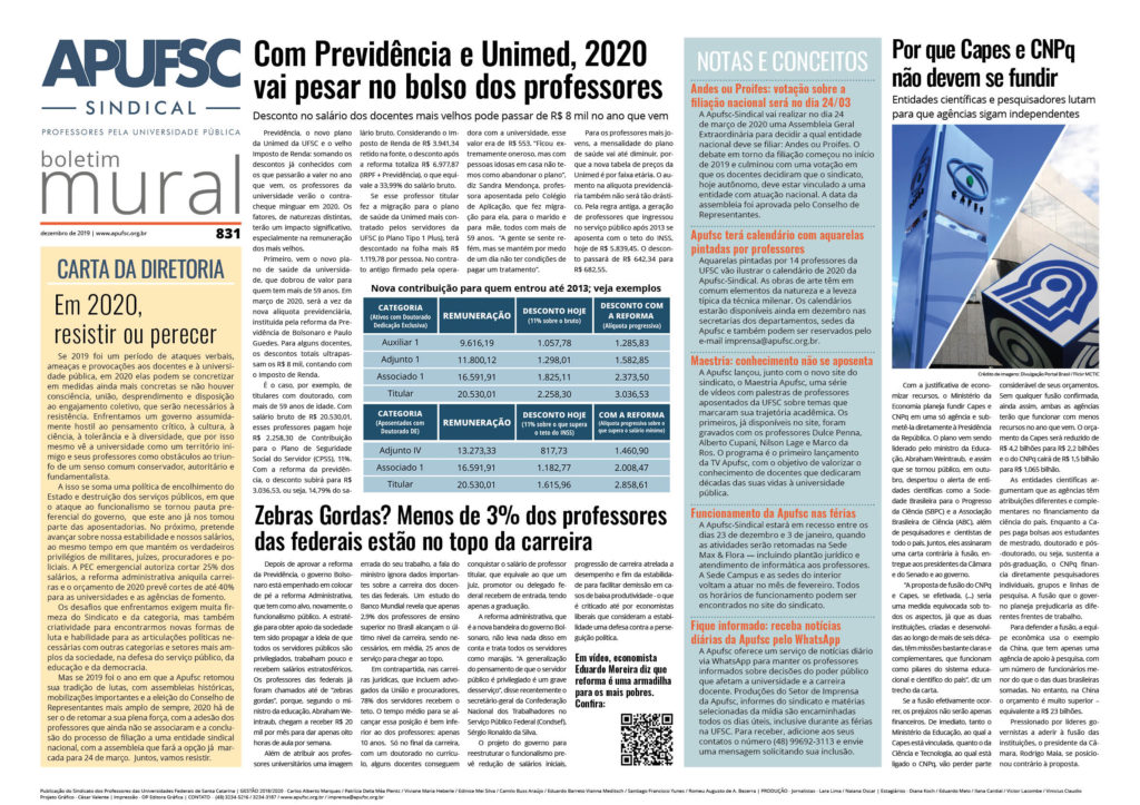 Nesta segunda-feira (9), a Apufsc publicou a edição número 831 do Boletim Mural, jornal distribuído nos centros de ensino da Universidade. Abaixo você confere na íntegra o conteúdo das matérias e a Carta da Diretoria, assim como o texto da seção “Notas e Conceitos”.