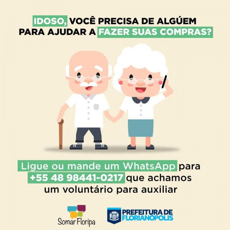 A Prefeitura de Florianópolis disponibilizou o telefone (48) 98441-0217 para que as pessoas, especialmente os idosos, possam pedir ajuda a uma rede de voluntários. A equipe da Somar Floripa, ao ser acionada, encontra um voluntário cadastrado na rede e faz contato com ele. Os voluntários podem, por exemplo, fazer compras no mercado ou na farmácia para quem é do grupo de risco.