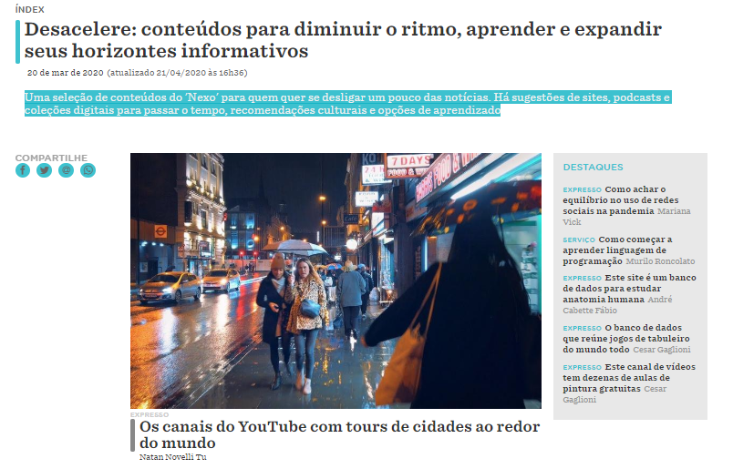 Nesta outra reportagem, o Nexo indica uma série de cursos gratuitos oferecidos por universidades e plataformas de streaming. Qualquer um que tenha interesse pode se cadastrar ou se inscrever nas plataformas online para aprender os mais diversos conteúdos.