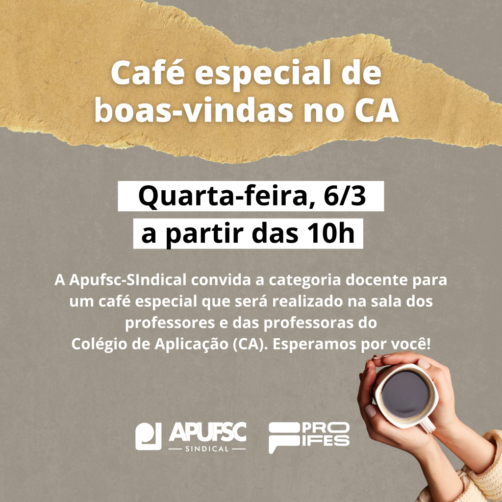 A Apufsc-Sindical prepara uma série de cafés especiais para das as boas-vindas à categoria docente da Universidade Federal de Santa Catarina (UFSC). Nesta quarta-feira, dia 6, o evento será realizado no Colégio de Aplicação, a partir das 10h. Todos os professores e professoras da unidade estão convidados a participar.