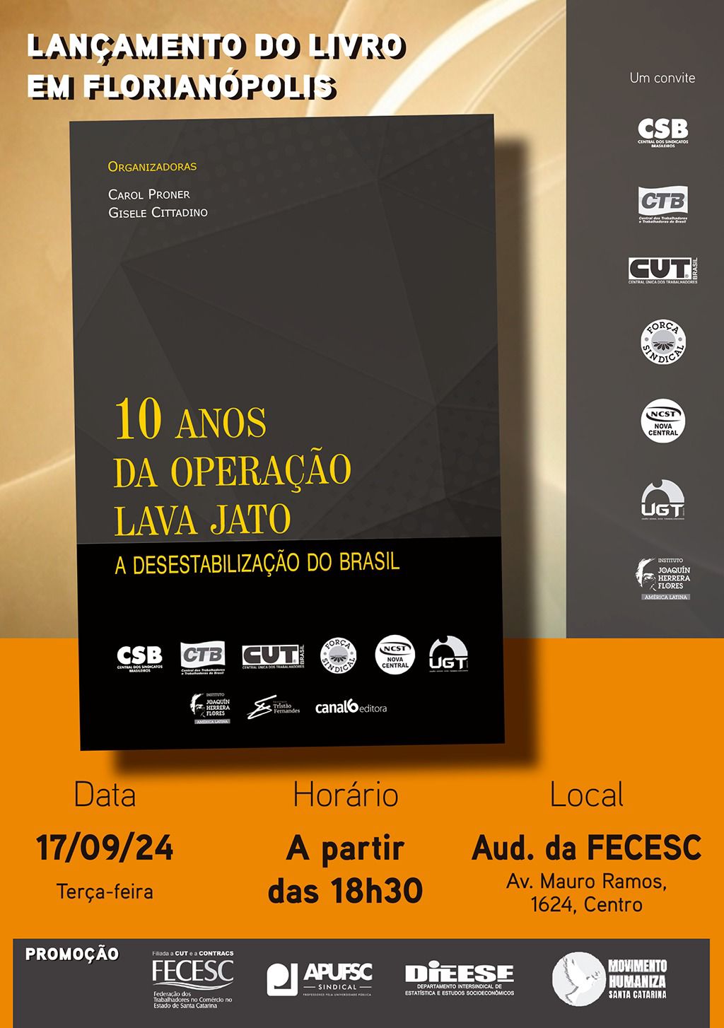 No dia 17 de setembro, às 18h30, ocorre o lançamento do livro “10 anos da Operação Lava Jato: a desestabilização do Brasil”, organizado por Carol Proner e Gisele Cittadino. O evento será no auditório da Federação dos Trabalhadores do Comércio de Santa Catarina (Fecesc), na avenida Mauro Ramos, 1624, no centro de Florianópolis, e conta com o apoio da Apufsc-Sindical.