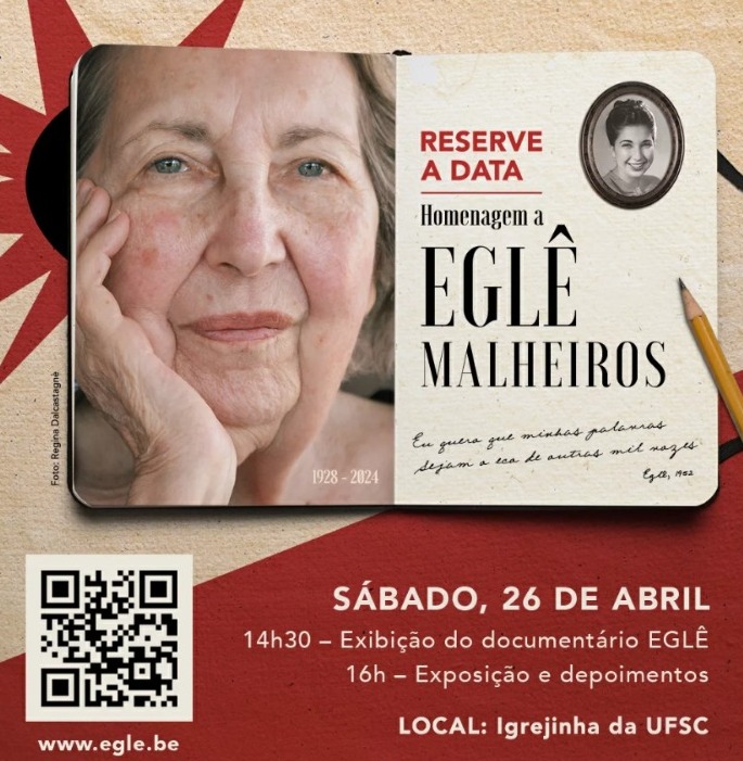 No dia 26 de abril, sábado, o Teatro Carmen Fossari e Igrejinha da Universidade Federal de Santa Catarina (UFSC) serão palco de homenagens à professora e escritora Eglê Malheiros, que faleceu no dia 17 de dezembro, aos 96 anos. Eglê também foi roteirista, advogada, feminista e militante política. Era esposa do também escritor Salim Miguel.