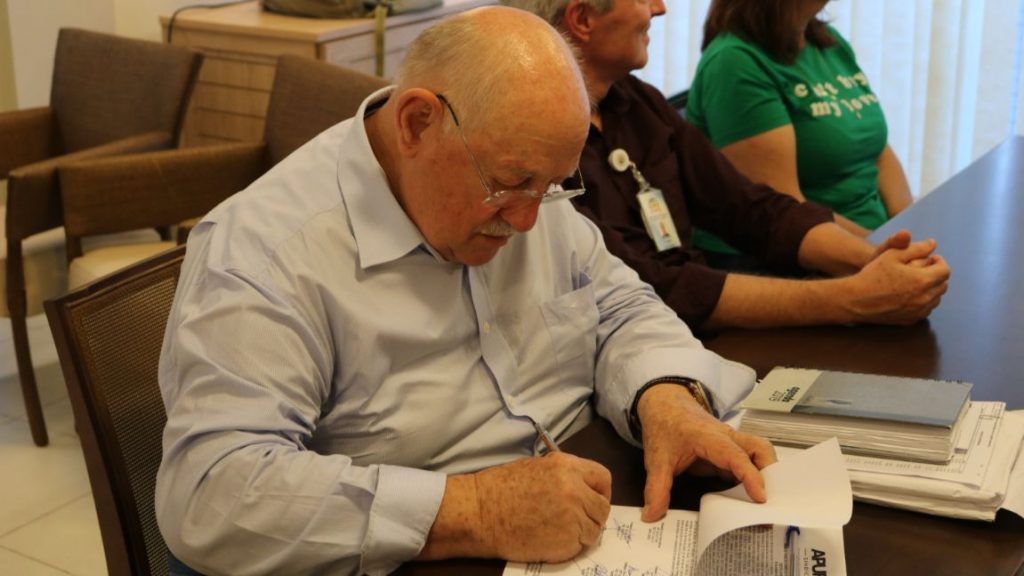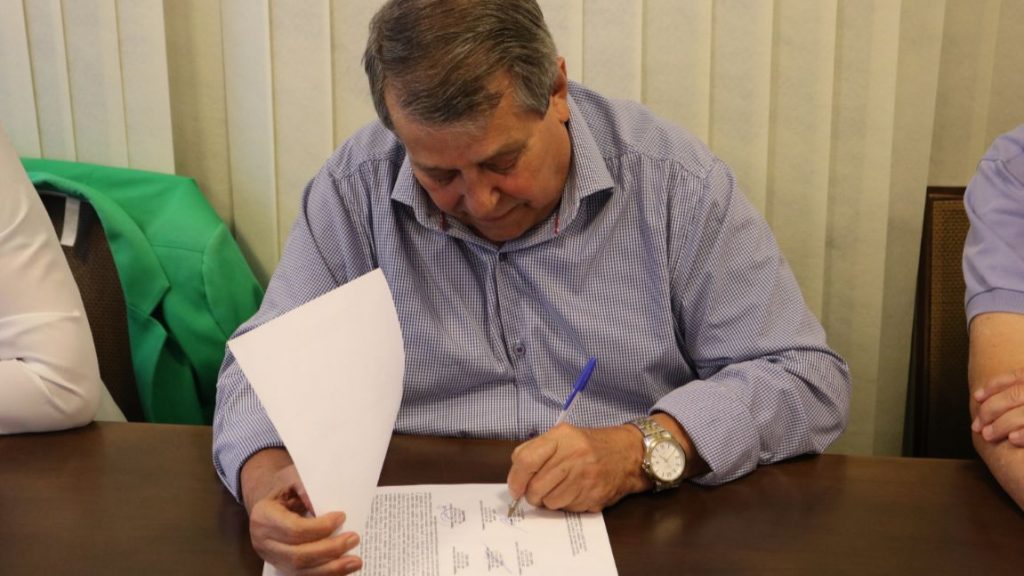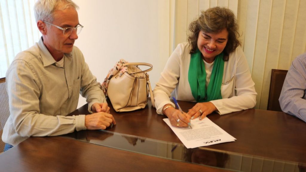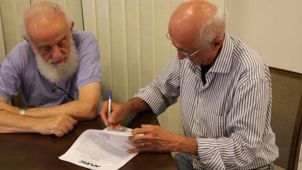 Professora Elisete Phitscher assina ata da posse do Conselho Fiscal da Apufsc ao lado do presidente, Bebeto Marques. Foto: Victor Lacombe/Imprensa Apufsc