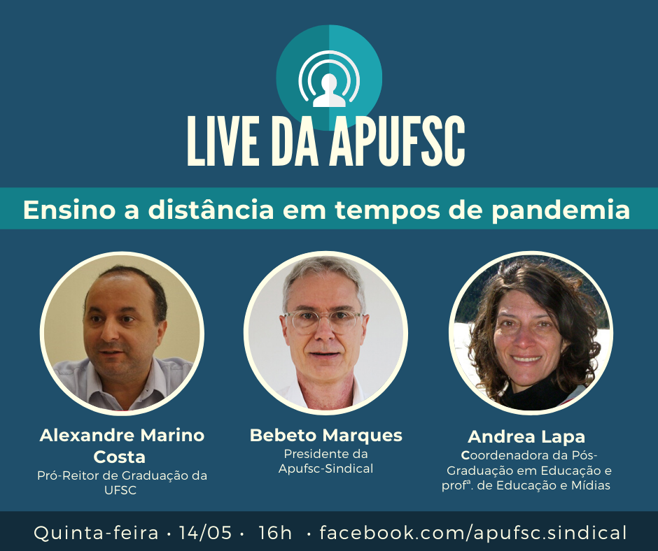 A Educação a Distância em tempos de pandemia é o tema da nova live da Apufsc-Sindical, na próxima quinta-feira, dia 14 de maio, às 16h. O debate será transmitido ao viv na página do sindicato no Facebook, com mediação do presidente da Apufsc, Bebeto Marques e participação do pró-reitor de Graduação da UFSC, Alexandre Marino, e da especialista em EAD, Andrea Lapa, coordenadora da Pós-Graduação em Educação da UFSC.