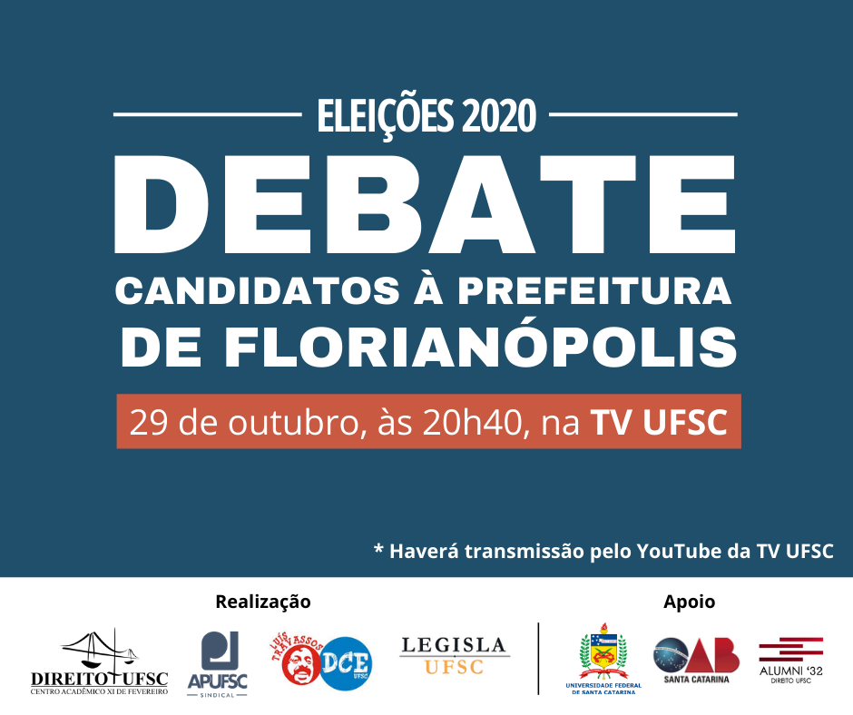 No dia 29 de outubro, às 20h40, o Centro Acadêmico XI de Fevereiro (CAXIF) do curso de Direito da federal de Santa Catarina, vai promover um debate entre os candidatos à prefeitura de Florianópolis. O objetivo é oferecer um espaço democrático de discussão política antes do primeiro turno das eleições municipais de 2020. O evento será transmitido pela TV UFSC ao vivo pelo canal aberto e à cabo de televisão e pelo canal da emissora no Youtube.
