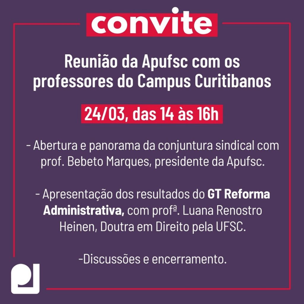 Na próxima quarta-feira (24), a partir das 14h, a Apufsc-Sindical promove uma reunião virtual com a participação do presidente do sindicato, Bebeto Marques. O evento é destinado aos docentes da federal de Santa Catariana do campus de Curitibanos, e tem como objetivo discutir e esclarecer alguns aspectos sobre a Reforma Administrativa: os impactos futuros na carreira docente, ameaças à aposentadoria, cortes de salários e congelamento das progressões.