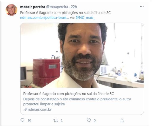 Em vídeo postado nas redes sociais (assista aqui), o chefe de gabinete da reitoria, Áureo Moraes, lembrou que Moacir Pereira tem assumido uma postura de combate à universidade, da qual é professor aposentado, negando a ciência e disseminando fake news. Aureo sugeriu que o colunista do ND renuncie à condição de jornalista. “De forma leviana e irresponsável, Moacir Pereira se aproveitou de uma notícia que circulou em redes sociais a respeito da pichação de uma cerca de uma propriedade privada, atribuindo a autoria dessa ação à UFSC e a um professor da UFSC. Mais do que isso: publicando e mantendo a publicação em vários espaços da fotografia do professor André Báfica, uma das fontes mais respeitadas nesse período de pandemia.”