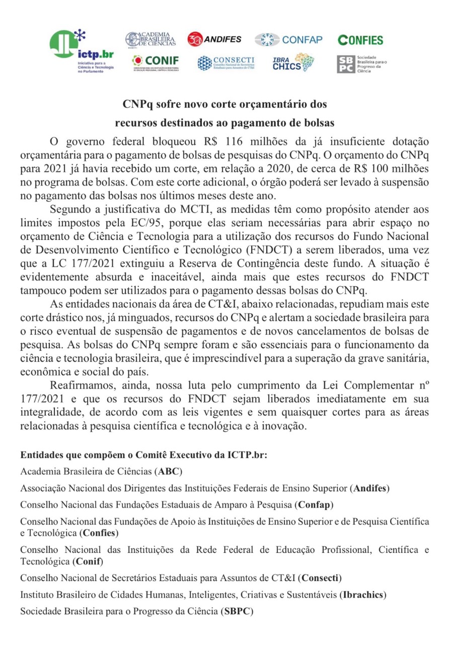“As entidades nacionais repudiam mais este corte drástico nos, já minguados, recursos do CNPq e alertam a sociedade brasileira para o risco eventual de suspensão de pagamentos e de novos cancelamentos de bolsas de pesquisa”, destaca-se, na nota.