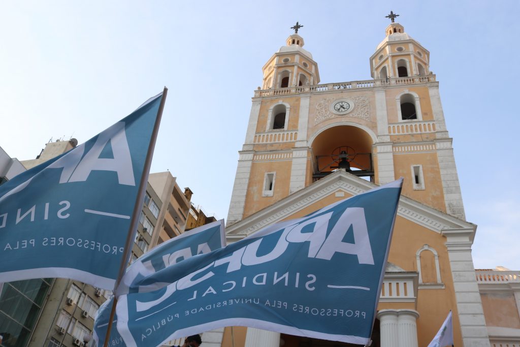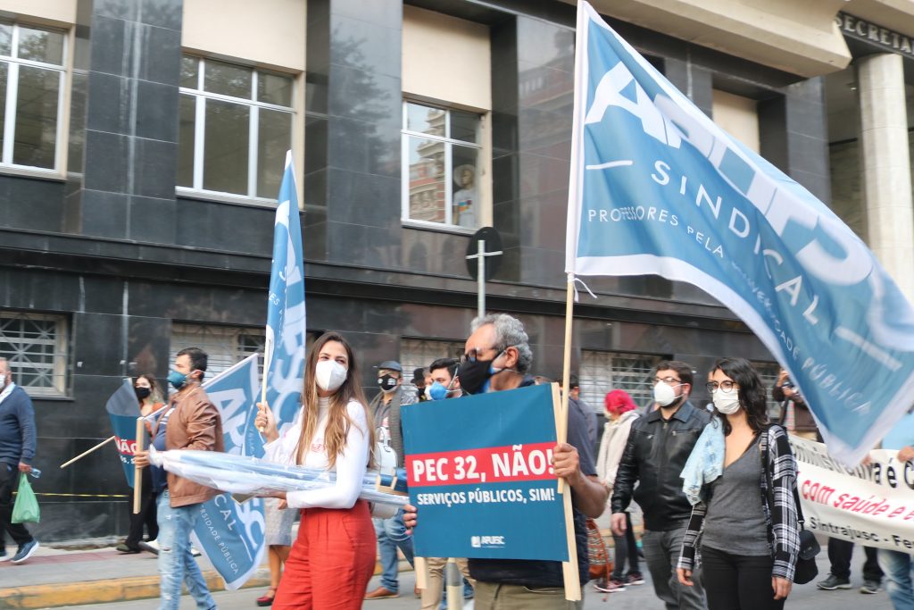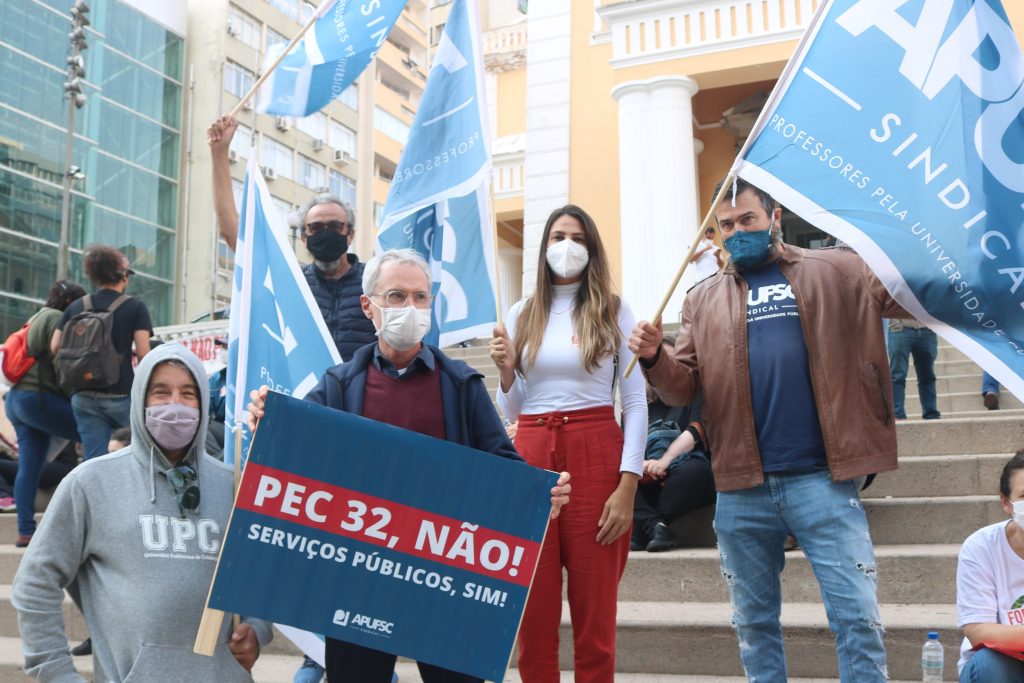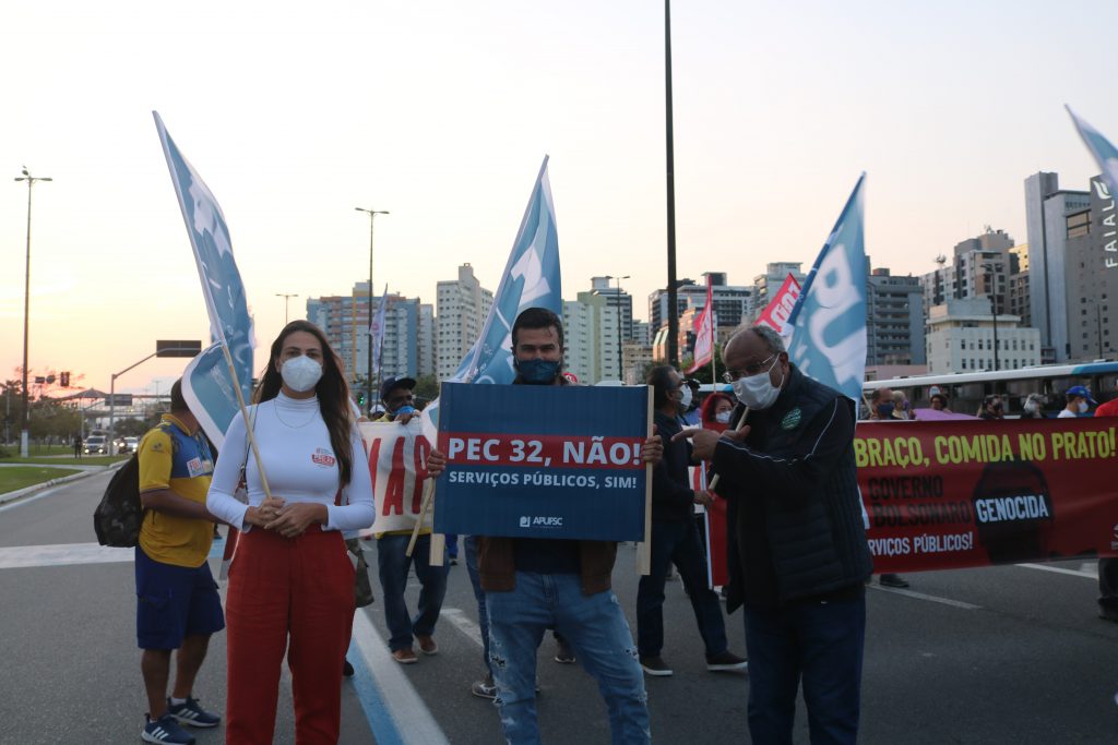 Sindicatos e servidores públicos se reuniram na tarde desta quarta (18) em frente à Catedral de Florianópolis para protestar contra a reforma administrativa. O ato faz parte da agenda de mobilizações criada para pressionar os deputados a votarem contra a PEC 32. A Apufsc participou da caminhada que percorreu algumas ruas da cidade.