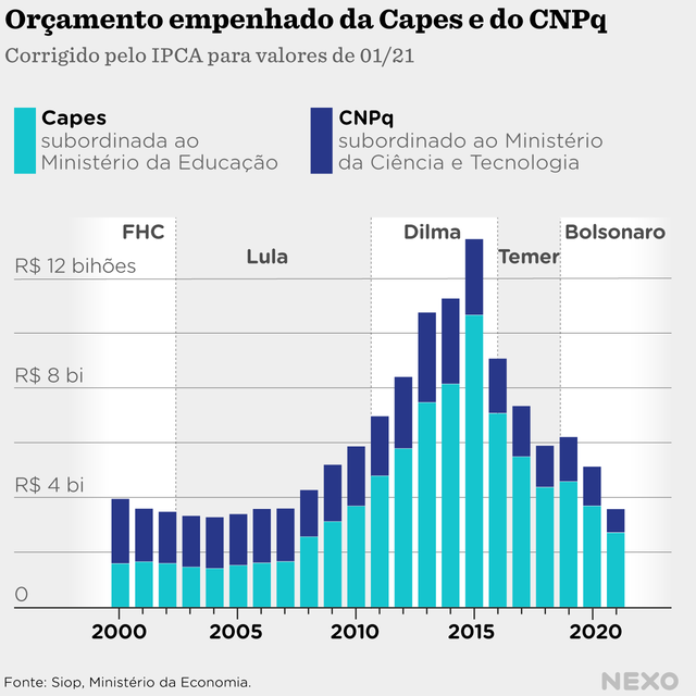 Somados, a Capes (Coordenação de Aperfeiçoamento de Pessoal de Nível Superior) e o CNPq (Conselho Nacional de Desenvolvimento Científico e Tecnológico) tiveram, desde 2015, uma redução real de 9,8 bilhões de reais em seus orçamentos.