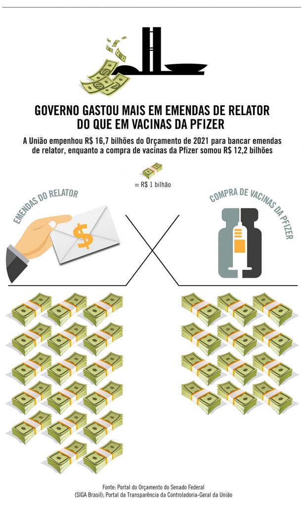 A União destinou 16,7 bilhões de reais do Orçamento de 2021 às emendas de relator, instrumento pouco transparente de repasse de verbas a parlamentares. Esse valor supera o que foi pago na compra de vacinas contra a Covid-19 da farmacêutica Pfizer – 12,2 bilhões de reais. A Pfizer foi a empresa que mais recebeu recursos da União no último ano, durante a maior campanha de imunização da história do país. Até dezembro de 2021, o Brasil aplicou 153 milhões de doses de vacina da Pfizer – quase metade do total de doses.