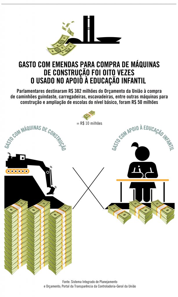 O principal destino das emendas parlamentares em 2021 foi a compra de caminhões guindaste, carregadeiras, escavadeiras, motoniveladoras e rolos compactadores da empresa XCMG Brasil Indústria LTDA, localizada em Minas Gerais. Ao todo, os parlamentares destinaram 382 milhões de reais do Orçamento à compra desse maquinário. Já para a construção e ampliação de escolas de educação infantil, incluindo compra de equipamentos e mobiliário, o governo empenhou 50 milhões de reais.