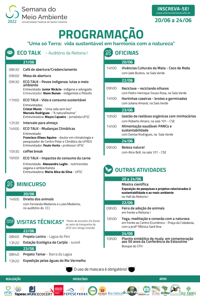 A Semana do Meio Ambiente UFSC 2022 ocorrerá entre os dias 20 e 24 de junho. O evento tem como objetivo a promoção da sustentabilidade por meio de ecotalks, oficinas, minicurso, visitas técnicas, mostra científica, yoga, feira de adoção de animais, entre outras atividades.