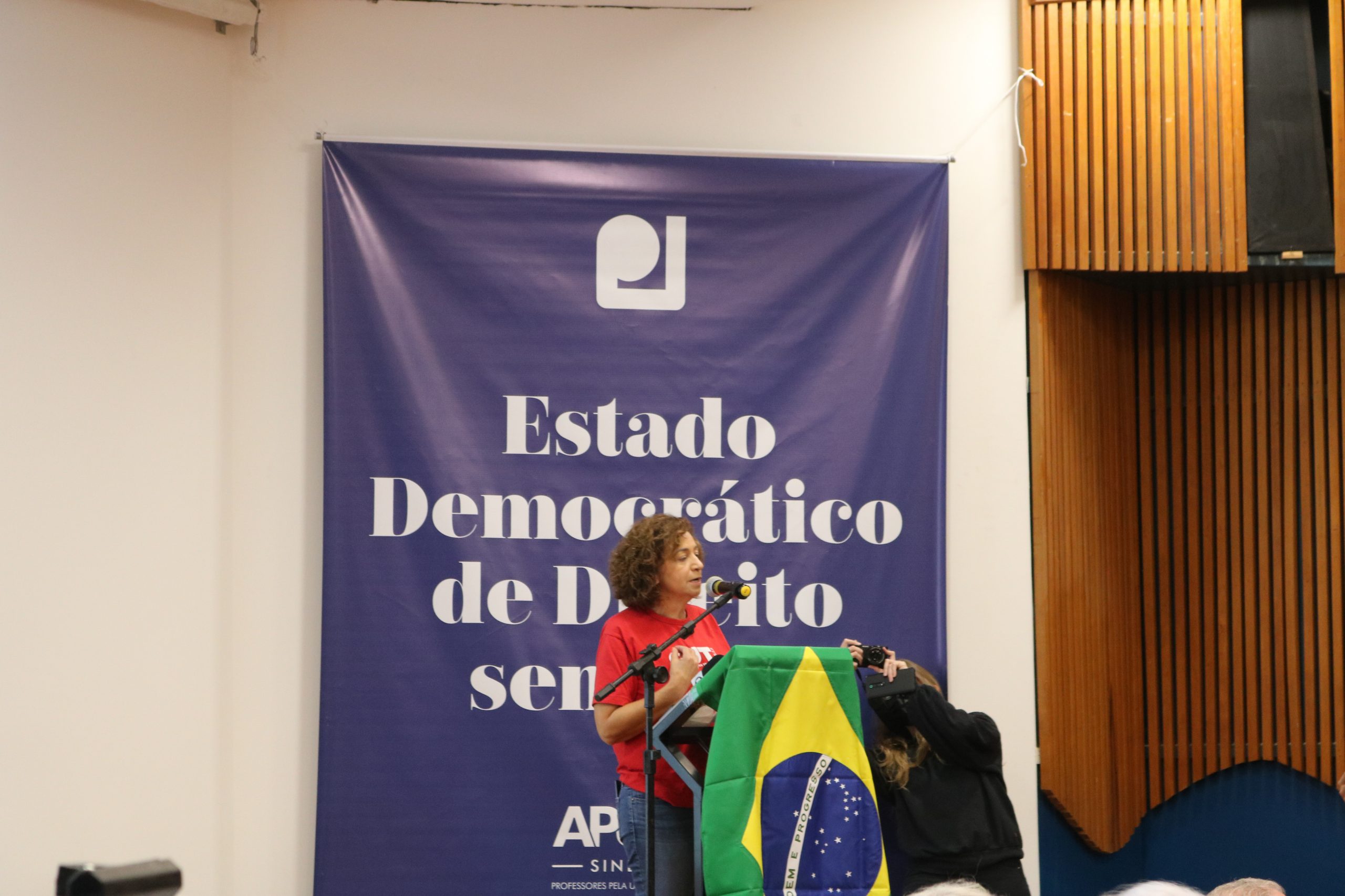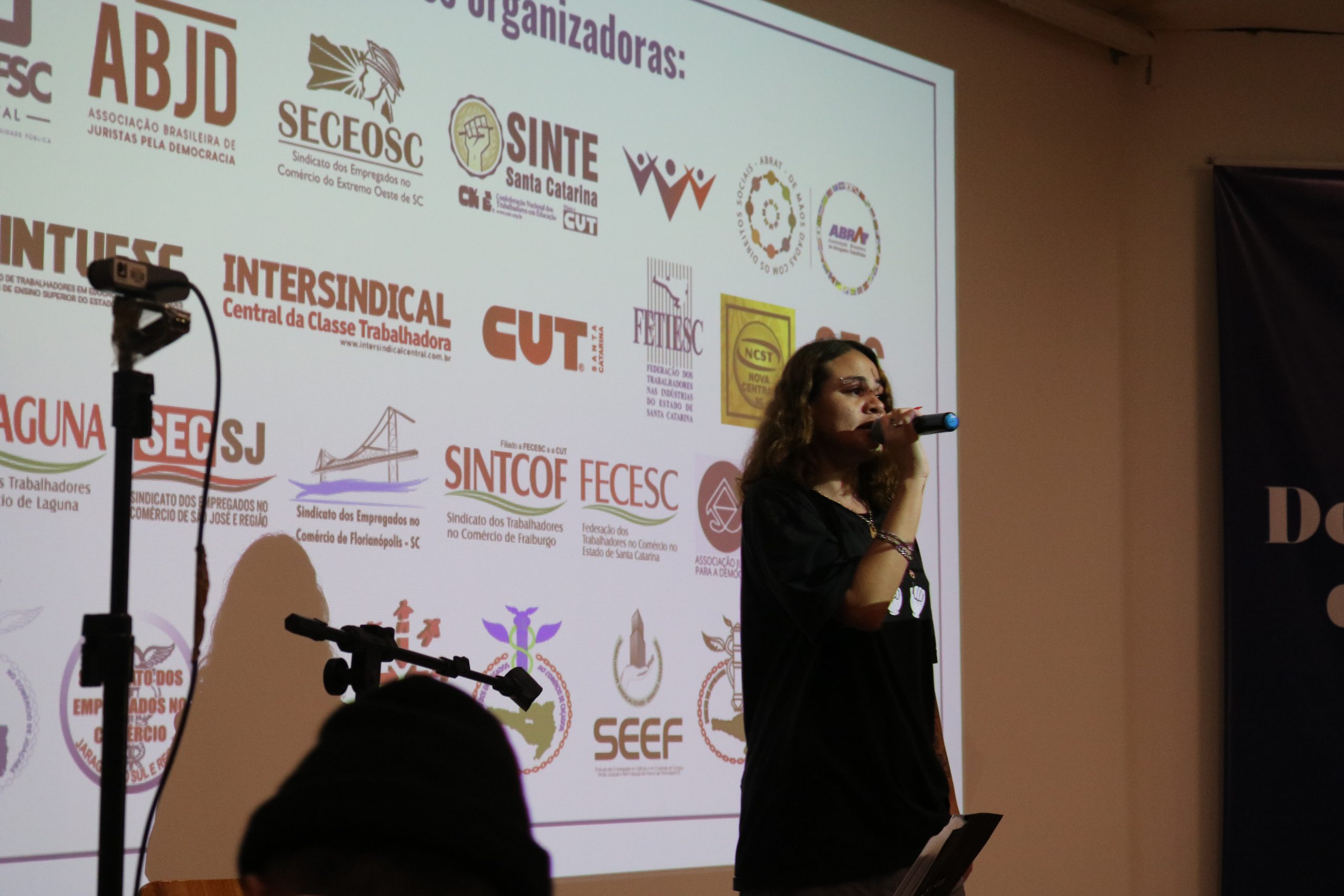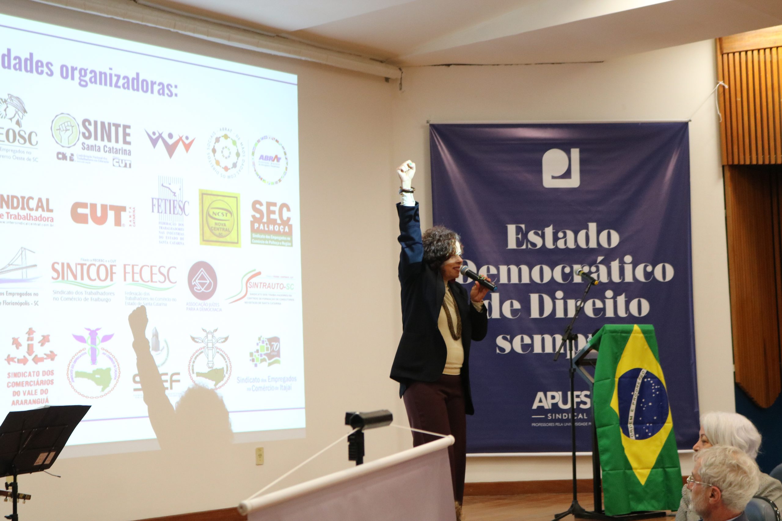 O ato seguiu com discurso de Ana Júlia Rodrigues, da Central Única dos Trabalhadores (CUT/SC), que ressaltou que é só na democracia que a classe trabalhadora pode lutar por seus direitos.