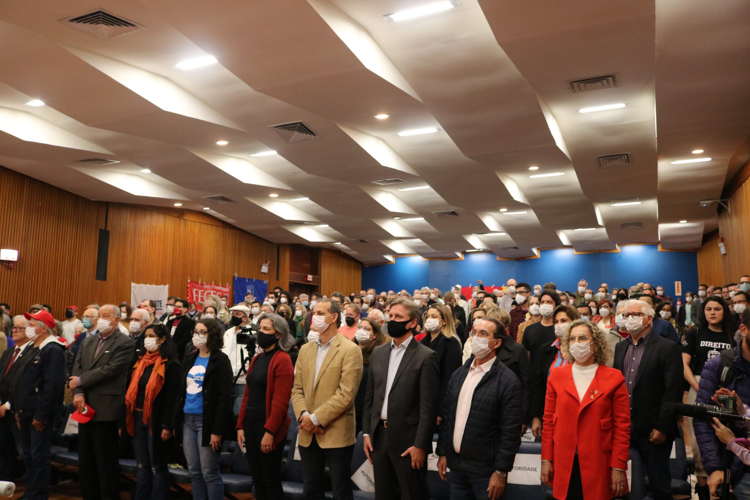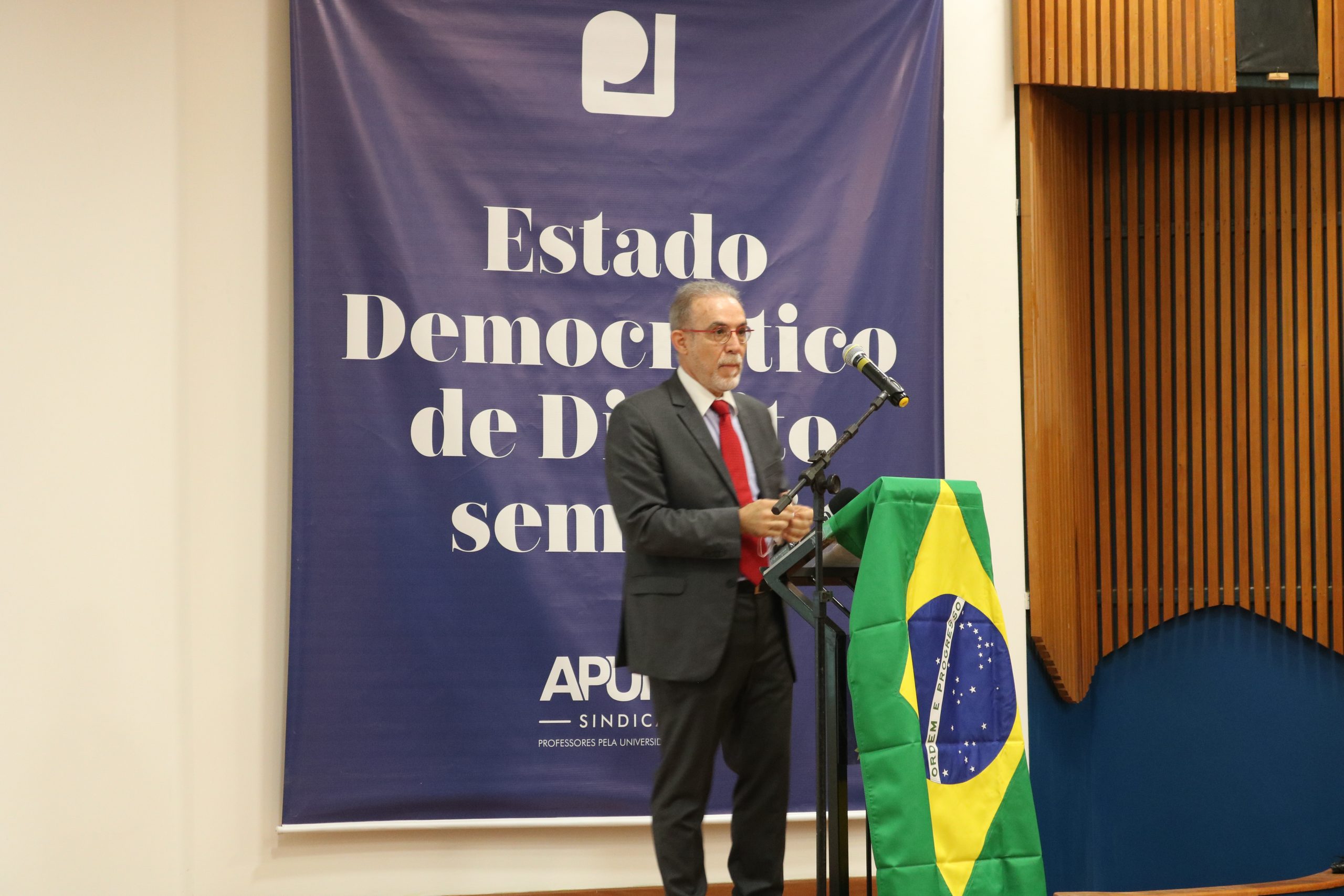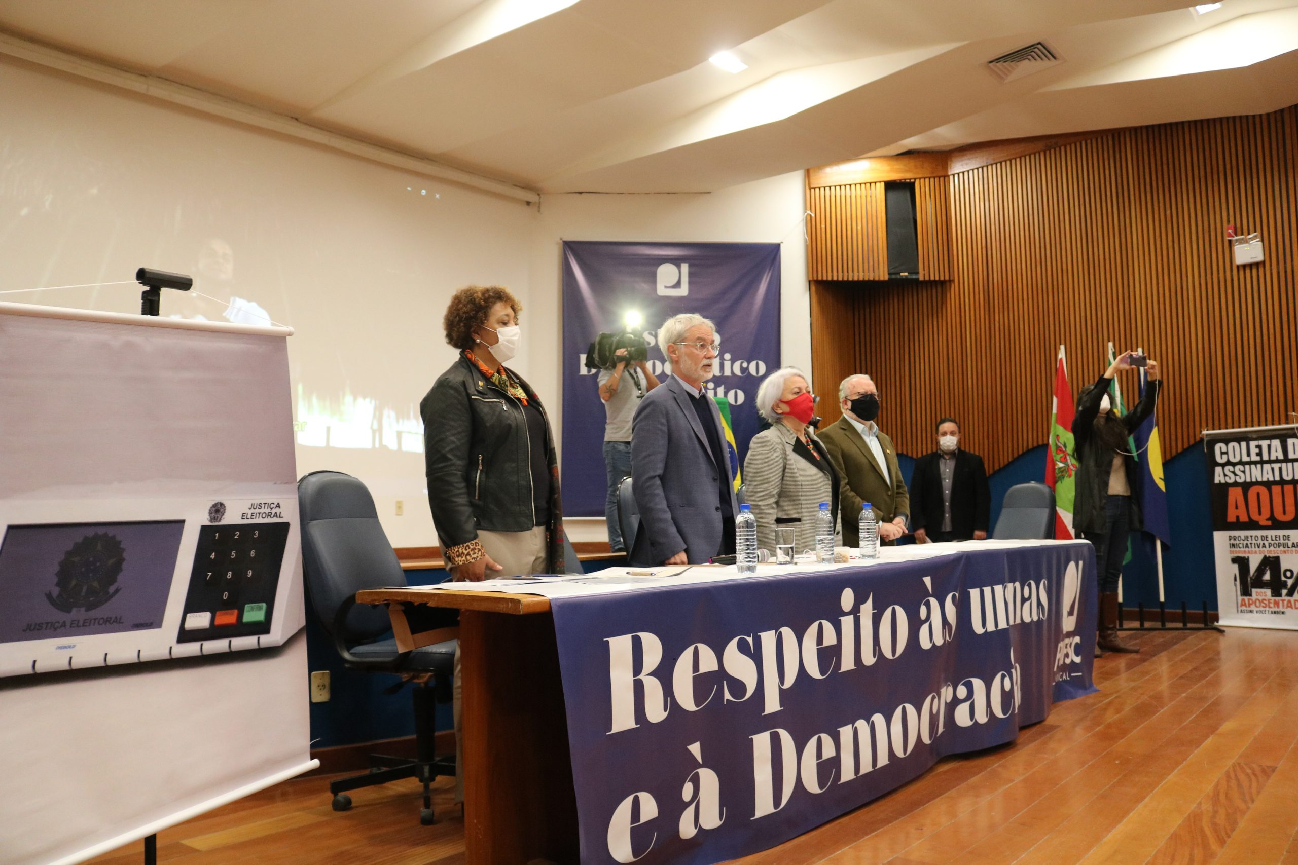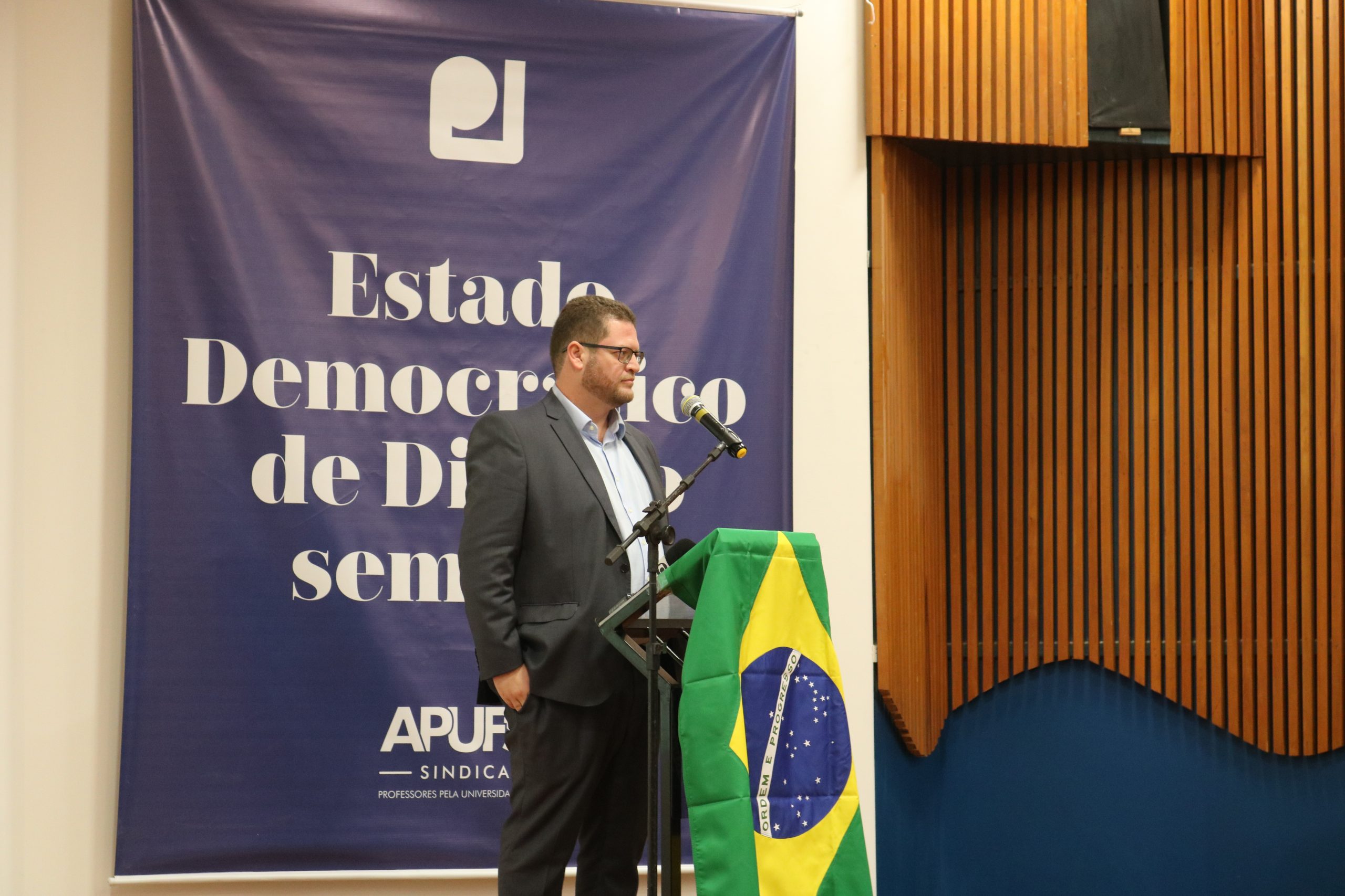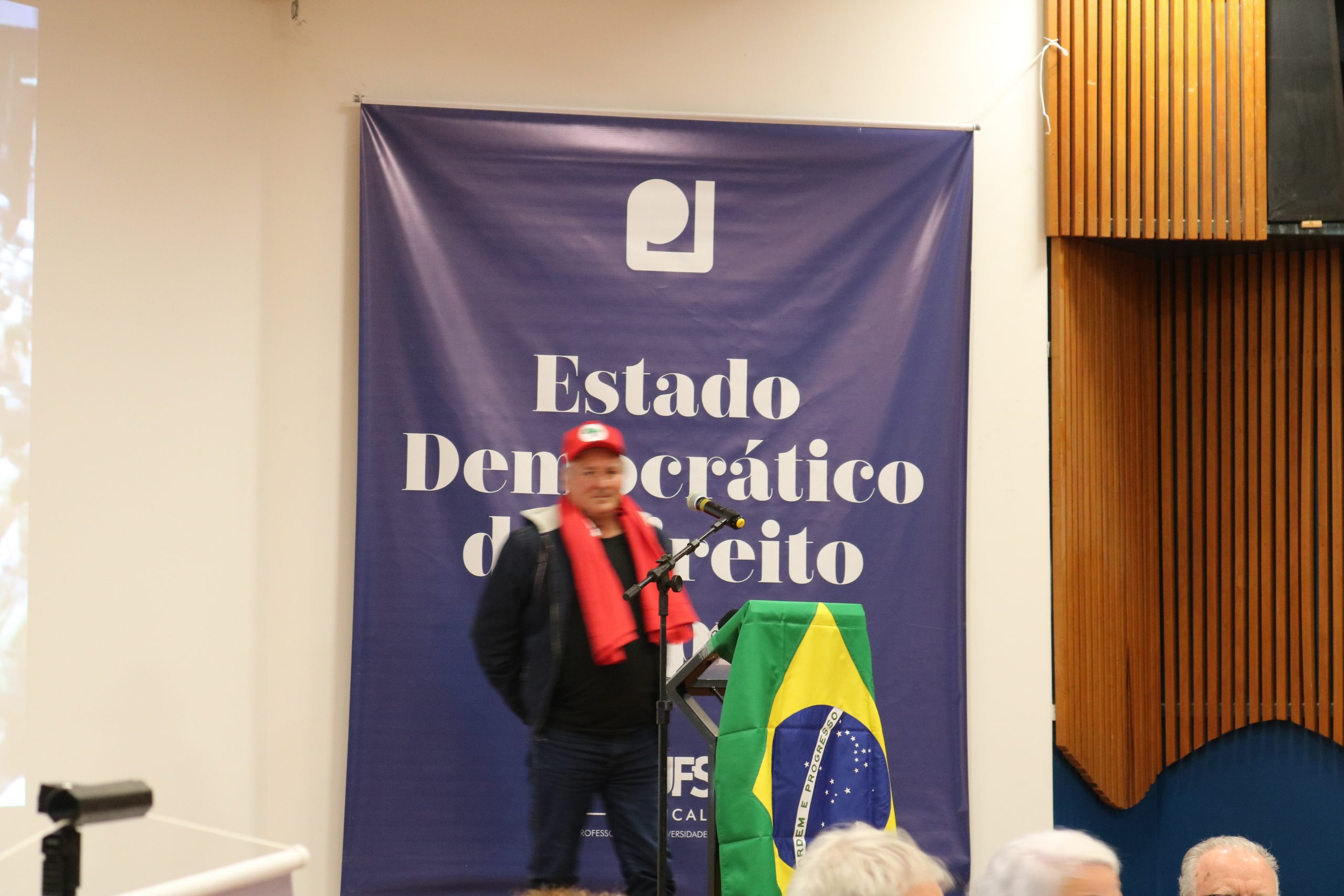 Carlos Alberto Marques, presidente da Apufsc-Sindical, abriu o evento com um discurso em que ressaltou a confiança nas urnas eletrônicas e na Justiça Eleitoral. “Como a história nunca fica no passado, não surpreende estarmos aqui para frear a tentativa de retorno ao regime autoritário em nosso país”, iniciou. Bebeto pontuou, porém, que “a democracia morre muito antes dos golpes e dos rompantes autoritários. Ela morre quando não gera mais emprego e renda, quando produz desigualdades e miseráveis, quando faz as pessoas não terem teto para morar e terra para plantar. ela seguramente morre quando ao povo é negada a voz e o voto”.