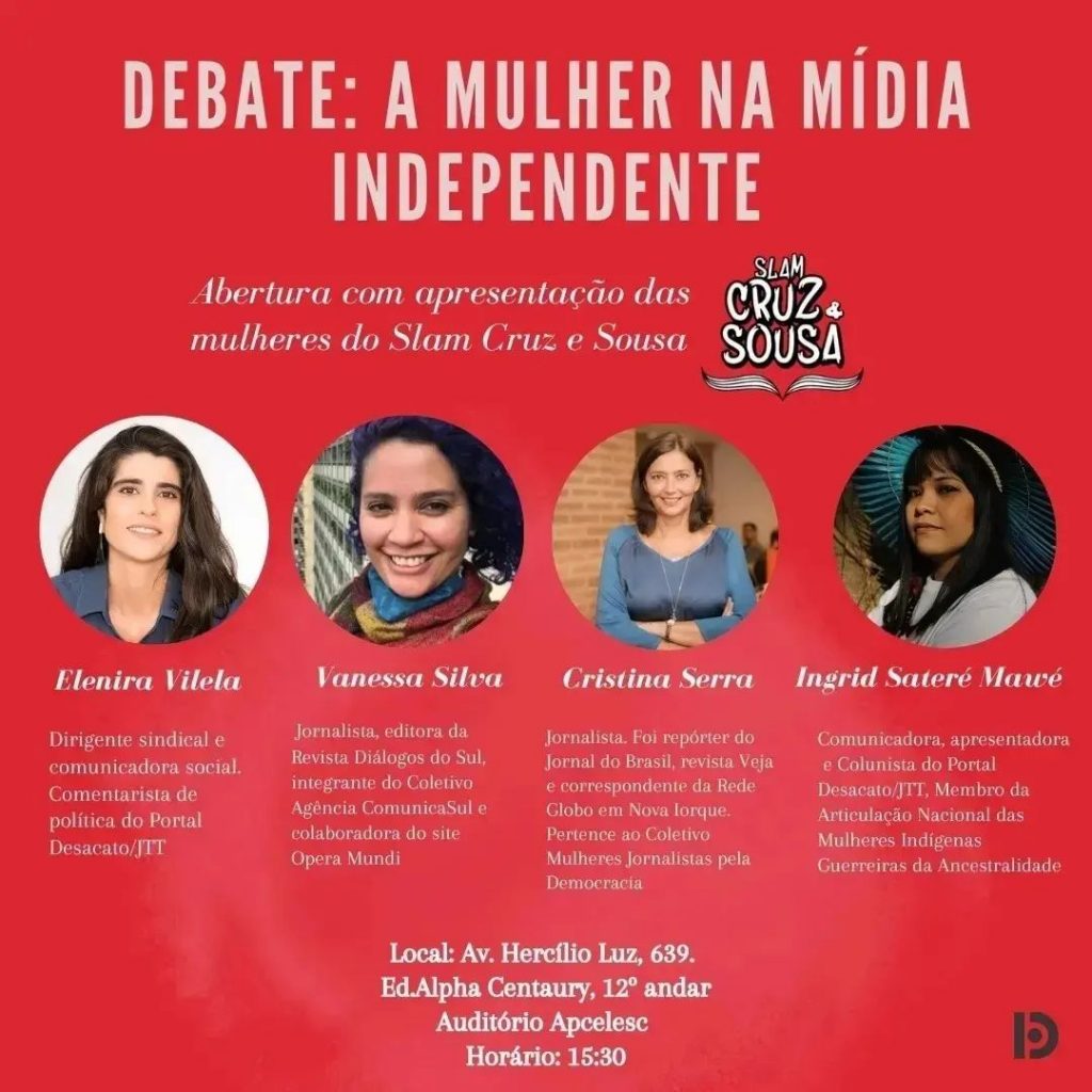Às 15h, ainda no auditório da APCelesc, as Mulheres do Slam Cruz e Sousa abrem o debate “A Mulher na Mídia Independente”, coordenado pela comunicadora indígena Ingrid Sateré Mawé. Serão palestrantes: Cristina Serra, jornalista e colunista do UOL e ex-repórter do Jornal Nacional em Nova Iorque; Vanessa Martina Silva, jornalista da Comunica Sul; e a comunicadora social e sindicalista Elenira Vilela.