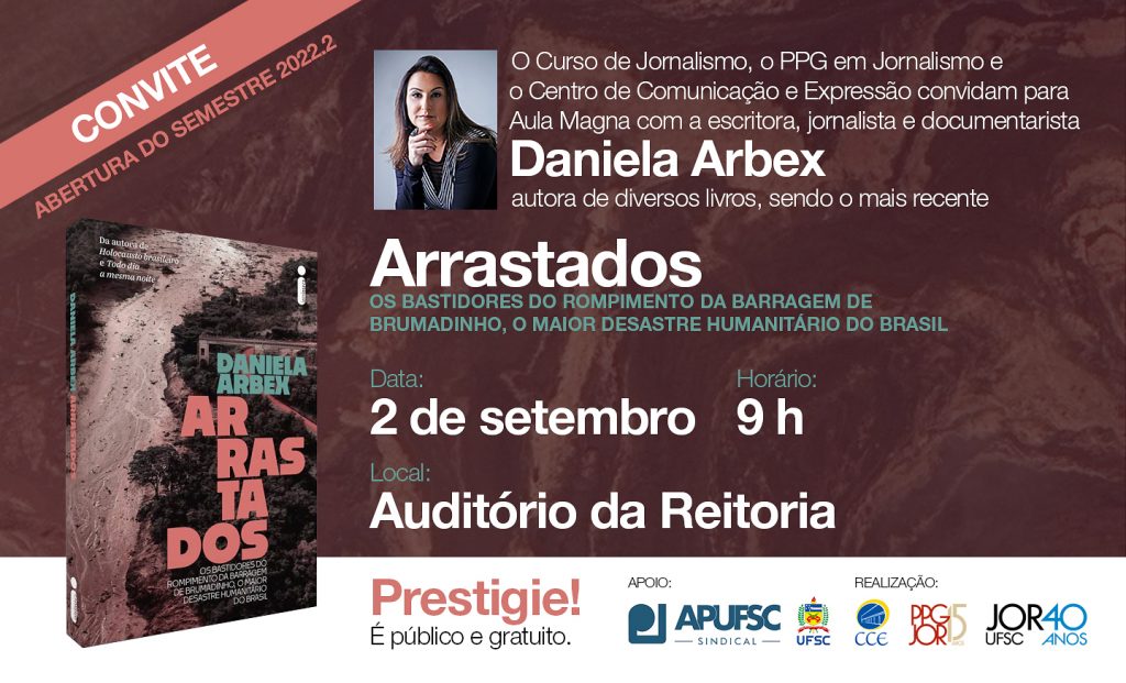 O Curso de Jornalismo, o Programa de Pós-Graduação em Jornalismo e o Centro de Comunicação e Expressão (CCE) promovem nesta sexta-feira, dia 2, às 9h, no Auditório da Reitoria, a Aula Magna de abertura do semestre 2022.2. O evento, que tem apoio da Apufsc-Sindical, traz como convidada a jornalista, escritora e documentarista Daniela Arbex, considerada uma das maiores repórteres investigativas do país. Ela vai falar sobre jornalismo, reportagem e metodologia de investigação jornalística e de seu livro mais recente: “Arrastados: os bastidores do rompimento da barragem de Brumadinho, o maior desastre humanitário do Brasil”, lançado no início de 2022. A aula é aberta ao público e oferece certificado de participação.