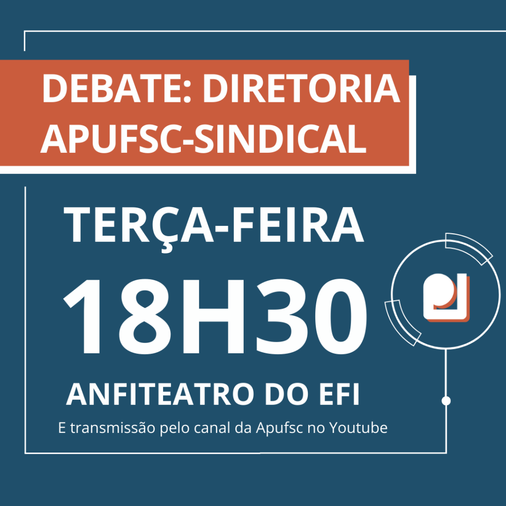 A Comissão Eleitoral e Imprensa da Apufsc-Sindical realizam nesta terça-feira, dia 27, às 18h30, debate com as duas chapas que disputam a eleição para Diretoria do sindicato: Apufsc – Mais forte nas lutas e Composição: Autonomia e Democracia. O evento será no anfiteatro do Espaço Físico Integrado (EFI) do campus Trindade da Universidade Federal de Santa Catarina (UFSC), em Florianópolis. O debate também será transmitido pelo canal da Apufsc no YouTube.