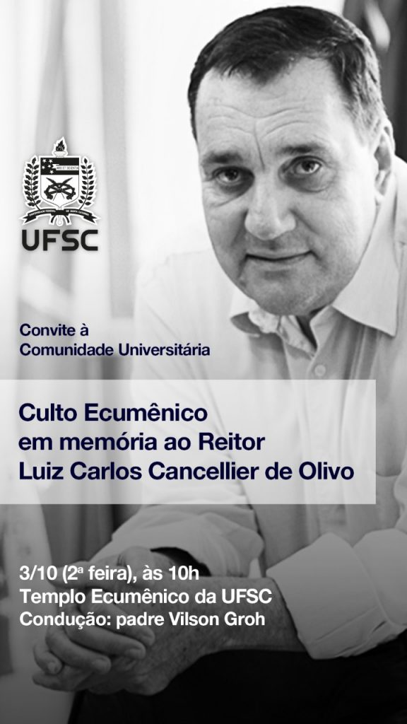 A Reitoria da Universidade Federal de Santa Catarina (UFSC) promove, no dia 3 de outubro, um culto ecumênico em homenagem à memória de Luiz Carlos Cancellier de Olivo, pela passagem de cinco anos de seu falecimento, reitor da Universidade à época. O evento será conduzido pelo padre Vilson Groh e acontecerá a partir das 10h, no Templo Ecumênico do Campus João David Ferreira Lima, em Florianópolis. De acordo com a UFSC, além da família de Cancellier, serão convidados representantes de religiões de matriz africana, islâmica, espírita, evangélica e outras.