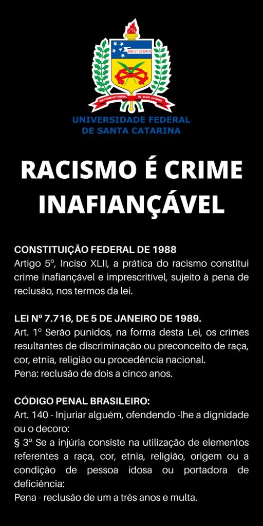 A Proafe também publicou uma nota de repúdio, em que reafirma seu compromisso com o enfrentamento institucional do racismo na universidade. “Racismo é crime inafiançável e está previsto na Lei 7716/1989, conhecida como Lei do Racismo. A lei prevê vários tipos de crimes de racismo, indicando que a pena pode ir de um a cinco anos de reclusão mais multa, dependendo da prática. Quando ocorre dentro da instituição é preciso uma política ampla que envolva acolhimento a vítimas, punição aos agressores e ações educativas de promoção e prevenção. A UFSC está construindo sua Política Institucional de Enfrentamento ao Racismo com previsão de encaminhamento ao Conselho Universitário ainda em 2022 e conta com o apoio da comunidade universitária para sua efetivação. A Proafe reafirma o compromisso de seguir combatendo o racismo na universidade e acolhendo as vítimas. Racismo é crime e não será tolerado!”
