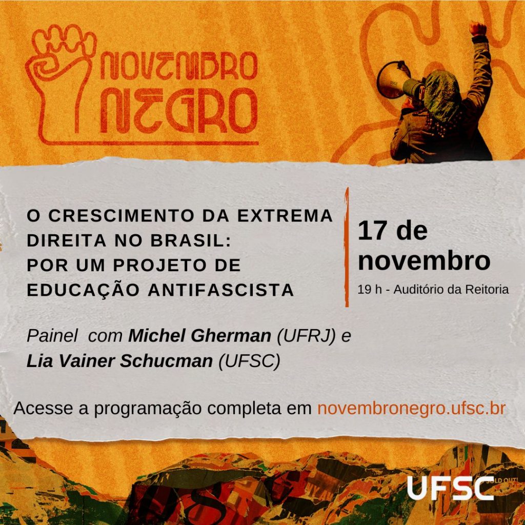 A Universidade Federal de Santa Catarina (UFSC) promove nesta quinta-feira, dia 17, às 19h, no Auditório da Reitoria, em Florianópolis, um painel intitulado “O crescimento da extrema direita no Brasil: por um projeto de educação antifascista”, como parte da programação do Novembro Negro. O evento é organizado pela Pró-Reitoria de Ações Afirmativas e Equidade (Proafe) e debaterá os temas de racismo e neonazismo, dado os episódios que estão ocorrendo no âmbito da universidade.