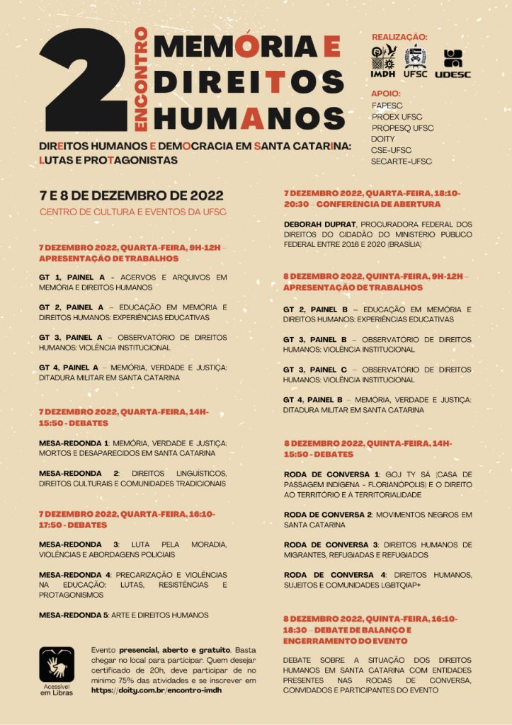 O 2° Encontro Memória e Direitos Humanos acontecerá presencialmente nos dias 7 e 8 dezembro 2022, no Centro de Cultura e Eventos do campus da Universidade Federal de Santa Catarina (UFSC) em Florianópolis. Organizado durante a Semana Internacional dos Direitos Humanos, o evento contará com apresentação de trabalhos, debates e conferências sobre a temática em Santa Catarina, no Brasil e na América Latina. A programação está disponível online.