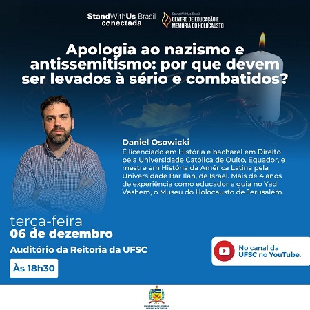 A StandWithUs Brasil e a Universidade Federal de Santa (UFSC) promovem a palestra “Apologia ao nazismo e antissemitismo: por que devem ser levados a sério e combatidos?”, com o professor Daniel Osowicki, que trabalhou por mais de quatro anos no Museu do Holocausto de Jerusalém. O evento será no Auditório da Reitoria, no campus Trindade, em Florianópolis, nesta terça-feira, dia 6, às 18h30min. A palestra tem acesso livre e será transmitida pelo canal da UFSC no YouTube.
