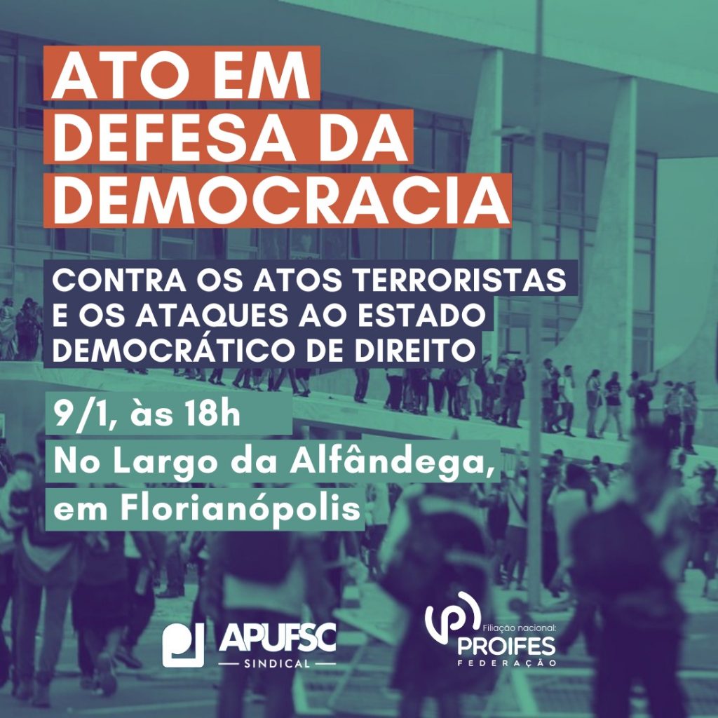 Ainda, conclamamos a comunidade docente a participar do ato que será realizado nesta segunda-feira, dia 9, a partir das 18h, no Largo da Alfândega, em Florianópolis, em defesa da democracia.