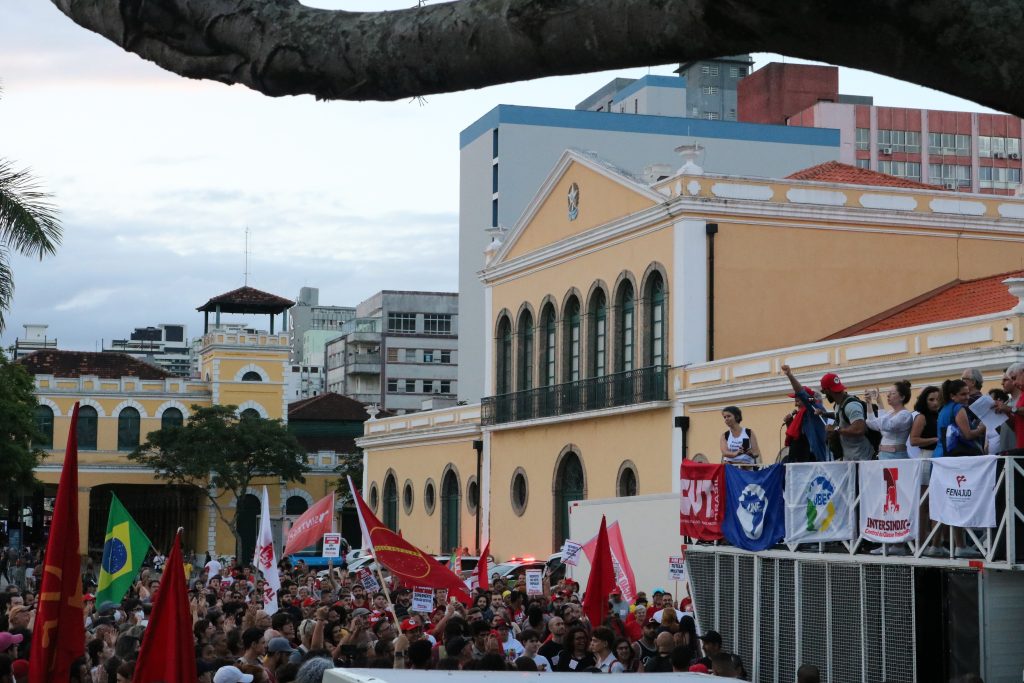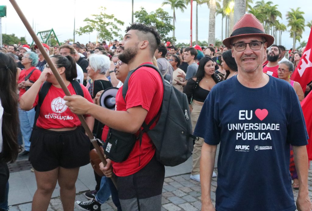 O Largo da Alfândega, no Centro de Florianópolis, foi tomado por pessoas que defendem o estado democrático de direito no fim da tarde desta segunda-feira, dia 9. A Apufsc-Sindical convocou a comunidade docente e a Diretoria esteve presente no ato, conduzido por entidades de classe e movimentos sociais.