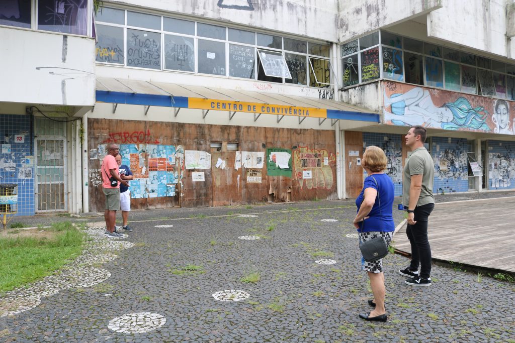 A Diretoria da Apufsc-Sindical visitou na manhã desta sexta-feira, dia 3, o Centro de Convivência da Universidade Federal de Santa Catarina (UFSC), a fim de dar continuidade ao projeto de revitalização do espaço, com recursos próprios. Um engenheiro civil acompanhou a vistoria junto do presidente da Apufsc, José Guadalupe Fletes, da secretária-geral, Viviane Maria Heberle, do primeiro-secretário, Carlos Barros Montez, e do administrador da sede do campus da Apufsc, Henrique Machado. Em 2021, o sindicato, com o apoio do Diretório Central dos Estudantes (DCE) e da Associação de Pós-Graduandos (APG), apresentou um ofício com a proposta de reforma do Centro à reitoria. A administração da UFSC está avaliando a viabilidade jurídica para que a ideia seja executada.