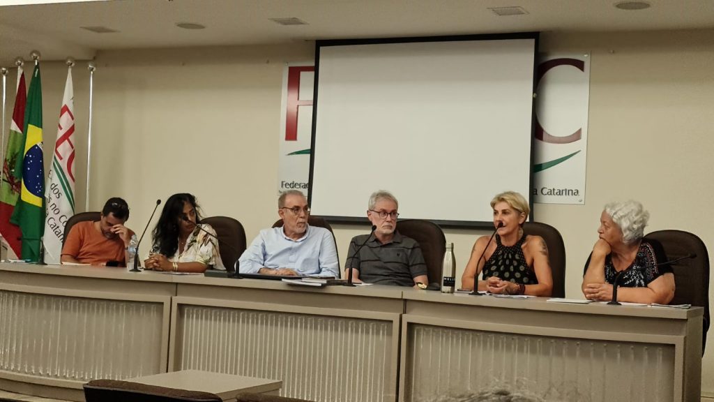 Na última terça-feira, dia 28, no auditório da Fecesc, em Florianópolis, o Movimento Humaniza Santa Catarina realizou uma reunião para discutir o estatuto e a estruturação do grupo, que tem o objetivo de ampliar, fortalecer e estruturar, de forma cada vez mais articulada, a defesa da democracia, dos direitos humanos, da paz, e a eliminação do nazifascismo no estado. O vice-presidente da Apufsc-Sindical, Adriano Duarte, e o ex-presidente do sindicato, Carlos Alberto Marquez, participaram da mesa do encontro.