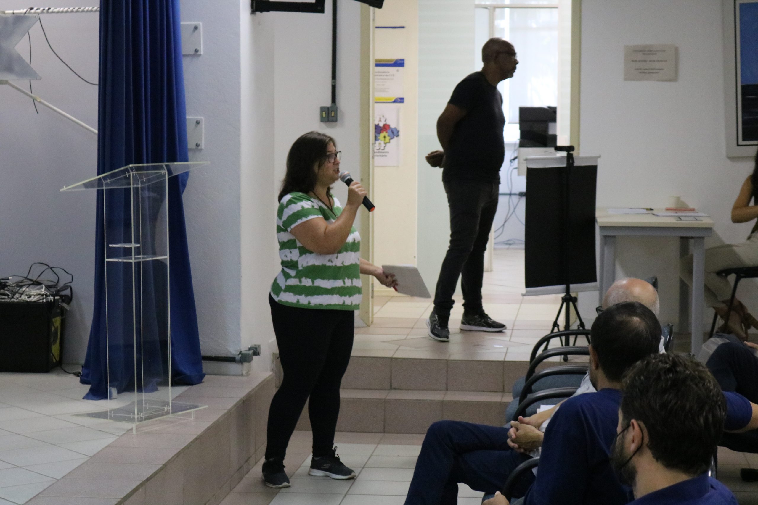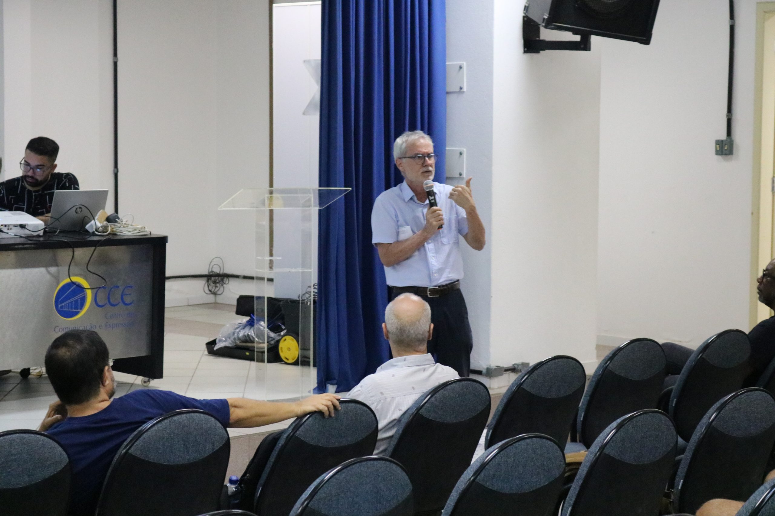 A mesa diretora da reunião ampliada foi formada pelo presidente da Apufsc, José Guadalupe Fletes e pela secretária-geral, Viviane Maria Heberle. A equipe executiva da Apufsc realizou o evento (Fotos: Lais Godinho/Apufsc)