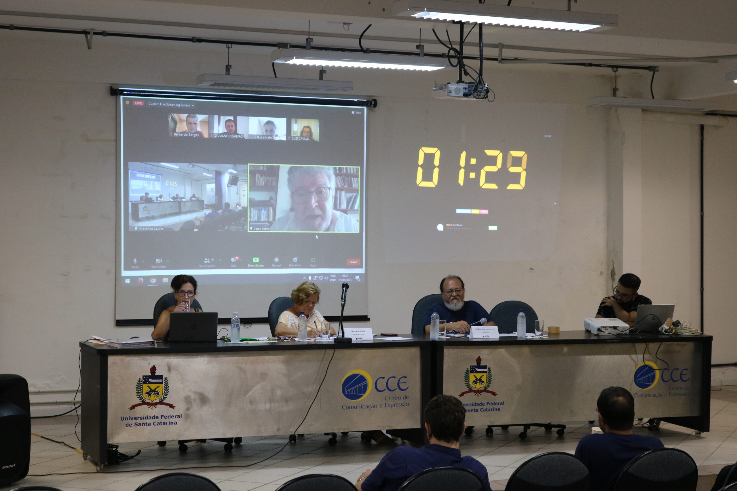A Apufsc-Sindical reuniu a categoria docente das universidades federais de Santa Catarina na manhã desta quarta-feira, dia 15, de forma híbrida, para discutir a contraproposta de reajuste salarial apresentada pelo governo federal após reunião da Mesa Permanente de Negociação, que aconteceu na última sexta-feira, dia 10. A contraproposta foi de 9% linear sobre os vencimentos dos/as servidores/as, a partir de maio, e se manteve o percentual de 43,% no auxílio-alimentação. Ao todo, cerca de 60 pessoas participaram da reunião, sendo 20 presencialmente no auditório do Centro de Comunicação e Expressão (CCE) da UFSC, em Florianópolis, e os demais por meio de videoconferência no Zoom e transmissão ao vivo no canal da Apufsc no Youtube.