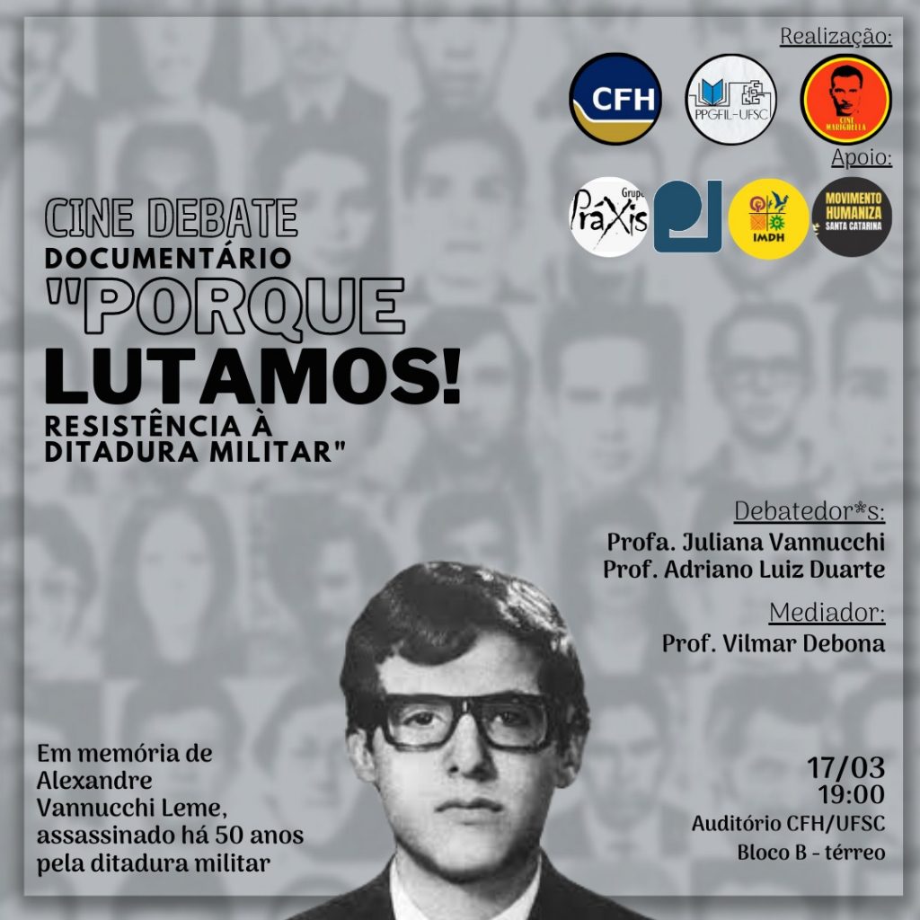 Em memória aos 50 anos da morte do estudante Alexandre Vannucchi Leme, assassinado pela ditadura militar, um cine debate realizado no auditório do Centro de Filosofia e Ciências Humanas (CFH) da Universidade Federal de Santa Catarina (UFSC) nesta sexta-feira, às 19h, irá exibir o documentário “Porque Lutamos! Resistência à Ditadura Militar”. O evento é organizado pelo CFH em parceria com o Programa de Pós-graduação em Filosofia (PPGFil), Centro Acadêmico Livre de Filosofia (Cafil) e Cine Marighella. A Apufsc-Sindical está entre os apoiadores, ao lado do Movimento Humaniza SC, Grupo Práxis e Instituto Memória e Direitos Humanos (IDMH).
