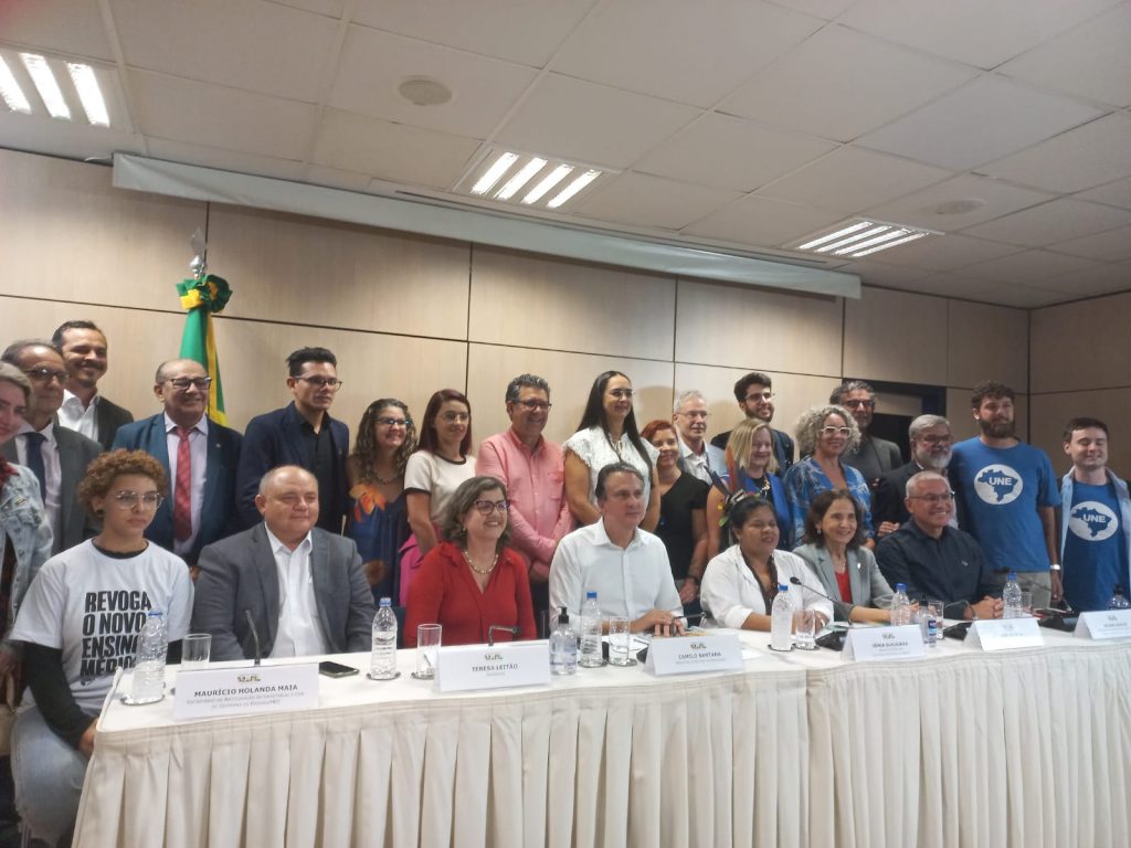 O ato de assinatura teve também a presença da ministra dos Povos Indígenas do Brasil, Sônia Guajajara, do presidente da Confederação Nacional dos Trabalhadores em Educação (CNTE), Heleno Araújo, da secretária-executiva do MEC, Izolda Cela, e do secretário de Articulação Intersetorial e com os Sistemas de Ensino do Ministério, Maurício Holanda Maia.