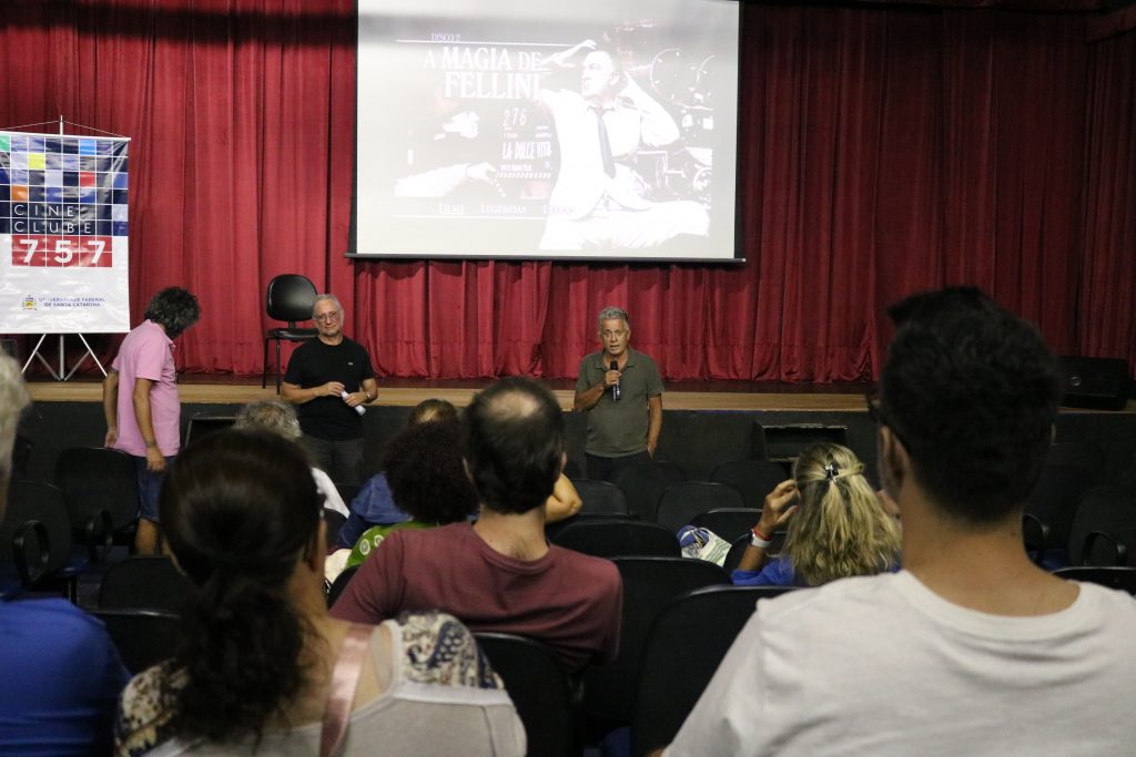 O Cineclube 757 teve sua estreia nesta segunda-feira, dia 27, com a obra do cineasta italiano Federico Fellini, apresentada pelo produtor cultural Antonio Cava. O evento foi realizado no Teatro Carmen Fossari e teve a presença da secretária de Cultura, Arte e Esporte da Universidade Federal de Santa Catarina (UFSC), Eliane Santana Dias Debus, do presidente da Apufsc-Sindical, José Guadalupe Fletes, e do vice-presidente, Adriano Luiz Duarte. O Cineclube 757 é promovido pela Apufsc-Sindical, Movimento Humaniza SC, Departamento Artístico e Cultural (DAC) e Secretaria de Educação a Distância (Sead) da UFSC.