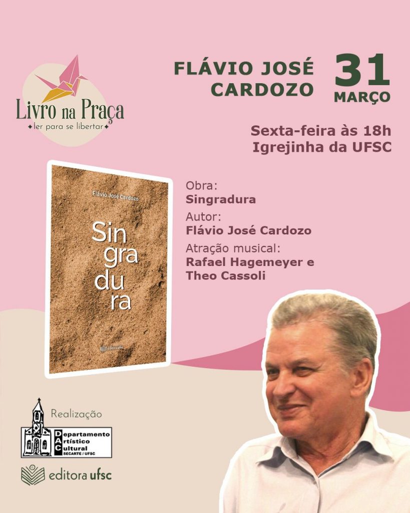 Projeto da Editora da Universidade Federal de Santa Catarina (UFSC), o Livro na Praça promove o encontro com o escritor Flávio José Cardozo nesta sexta-feira, dia 31, às 18h, na Igrejinha da UFSC. Cardozo é um dos principais nomes da literatura catarinense, com diversas obras publicadas que abrangem contos, crônicas e traduções. Natural de Lauro Muller, morou e estudou em cidades como Turvo, Tubarão, Curitiba, Florianópolis e Porto Alegre. Cardozo atuou na Editora Globo, de Porto Alegre. Foi diretor da Imprensa Oficial do Estado de Santa Catarina e da Fundação Catarinense de Cultura. É membro da Academia Catarinense de Letras.