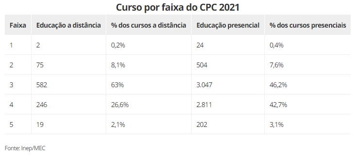 No total, foram avaliados 7.512 cursos: sendo 4.750 de licenciatura, 2.020 de bacharelado e 742 tecnológicos. As notas variam de 1 a 5, sendo: