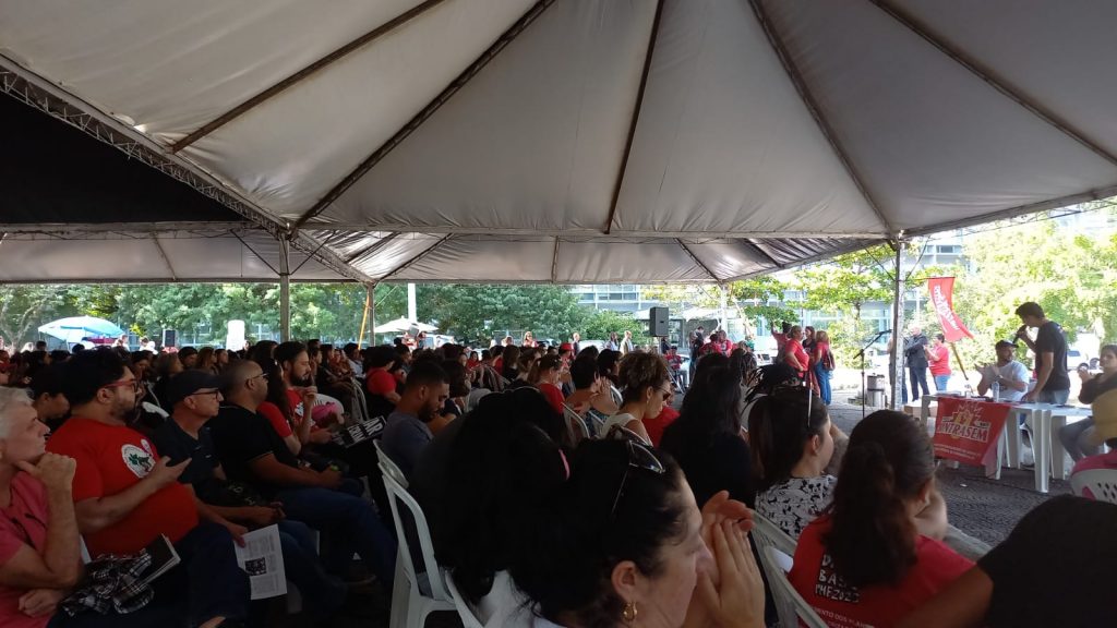 Assembleia do Sintrasem desta segunda-feira, dia 5, que teve participação do presidente da Apufsc-Sindical, José Guadalupe Fletes (Foto: Henrique Machado/Apufsc)