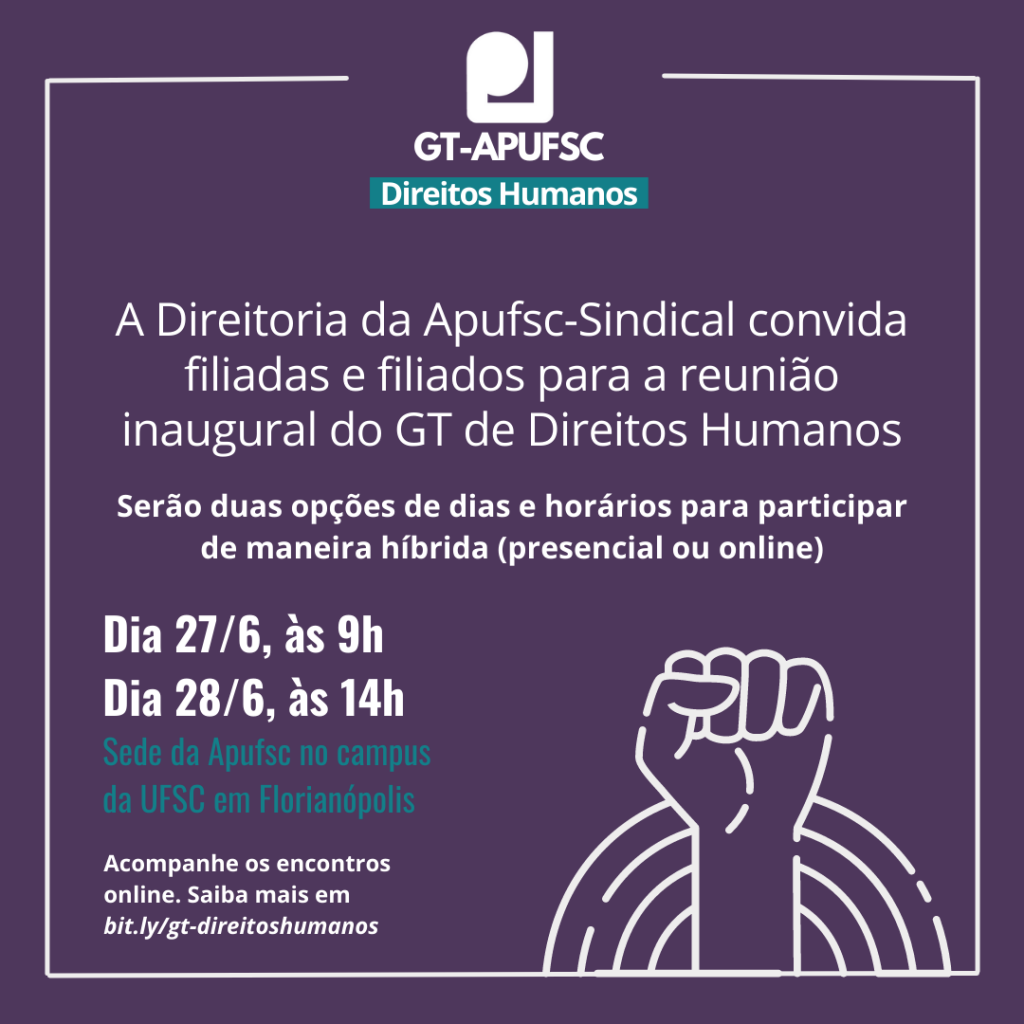 A Diretoria da Apufsc-Sindical convida filiadas e filiadas para a reunião inaugural do Grupo de Trabalho local de Direitos Humanos. Serão duas opções de dias e horários para participar, de maneira presencial ou remota: na terça-feira, dia 27, das 9h às 11h (clique aqui para participar online), e na quarta-feira, dia 28, das 14h às 16h (clique aqui para participar online).