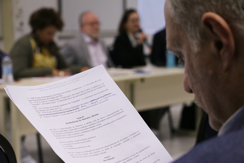 O presidente da comissão, Diogo Félix, apresentou um breve relato sobre o trabalho da comissão. Desde setembro de 2022, o grupo se debruça sobre a temática de festas. “Estudamos regulamentações de outras universidades, e cabe ressaltar que mais de 80% não possui, porque as festas são proibidas na maioria das instituições”.