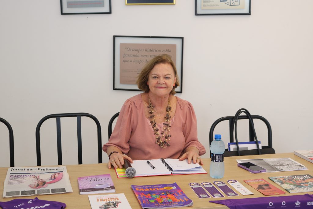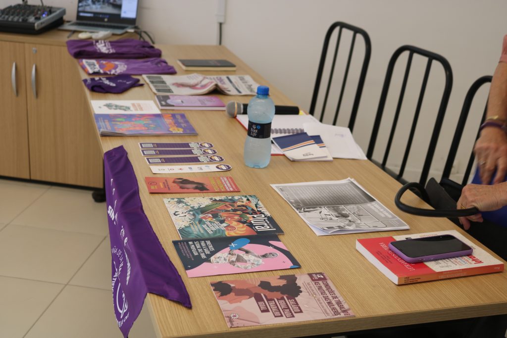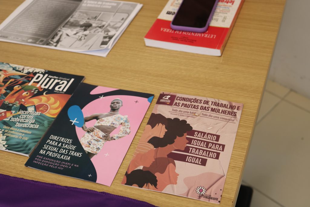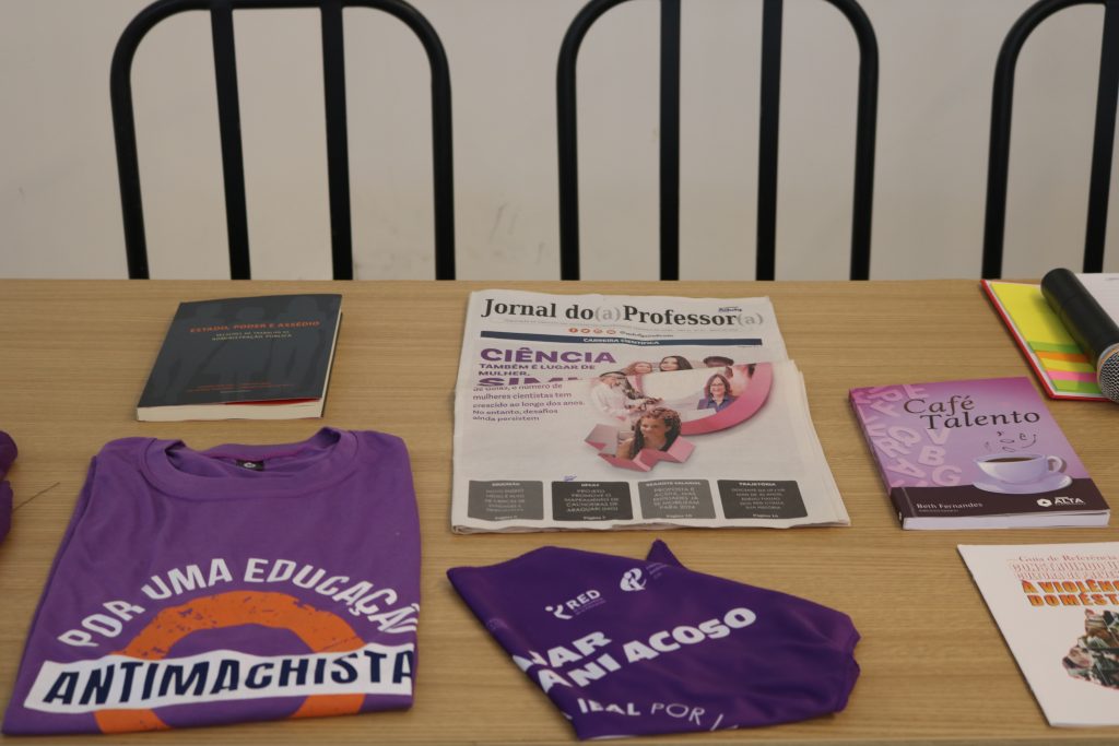 Viviane ressaltou que, com essa iniciativa, o GT busca tratar de assuntos como feminismos, interseccionalidade e direitos humanos “para que haja cada vez mais respeito entre as pessoas, dentro das diferentes diversidades socioculturais que existem, na universidade e no nosso sindicato.” A secretária-geral apresentou ainda uma série de livros, revistas e materiais de estudo que já estão disponíveis na sede da Apufsc para pesquisa dos docentes. Alguns deles, ela recebeu durante os dois cursos sobre feminismos que participou como membro do GT do Proifes.