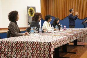 Na sequencia, iniciou-se o debate “UFSC antirracista e antifascista: como incluir a luta anticapacitista?”. A discussão contou com a participação da pró-reitora Leslie Sedrez Chaves, da coordenadora de Acessibilidade Educacional da UFSC, Bianca Souza, do coordenador-geral de Diversidade e Interseccionalidade da Secretaria Nacional dos Direitos da Pessoa com Deficiência (SNDPD), Raul de Paiva Santos, da professora da UFSC e chefe da Assessoria Especial de Educação e Cultura em Direitos Humanos do MDHC, Letícia Cesarino, e de Cátia Brito dos Santos, doutoranda em Saúde Coletiva na Universidade Federal da Bahia (UFBA) e integrante do movimento Vidas Negras com Deficiência Importam.