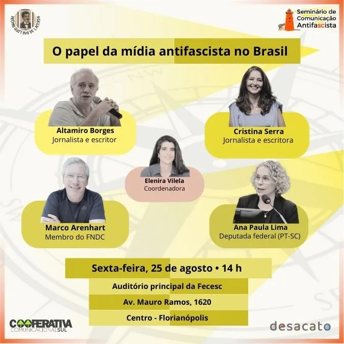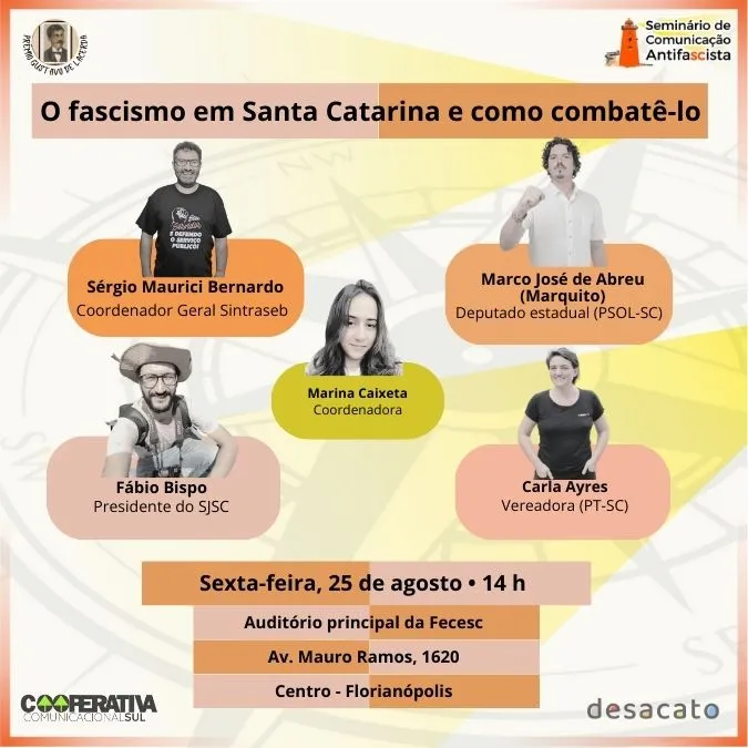 O seminário tem como debatedores profissionais de destaque no jornalismo nacional e local, parlamentares e representantes de sindicatos. Serão duas mesas: a primeira irá abordar o tema “O papel da mídia antifascista no Brasil” e a segunda” O fascismo em Santa Catarina e como combatê-lo”.