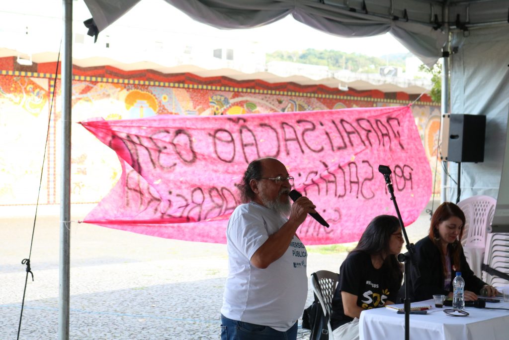 O Dia Nacional de Luta em Defesa do Serviço Público, realizado nesta terça-feira, dia 3, teve na programação local uma plenária que reuniu servidoras e servidores públicos de diferentes categorias na Praça da Cidadania da Universidade Federal de Santa Catarina (UFSC). O presidente da Apufsc-Sindical, José Guadalupe Fletes, e o professor Lino Peres, representante dos docentes aposentados, participaram do evento e, em suas falas, ressaltaram a importância da união na luta pela valorização do serviço público.