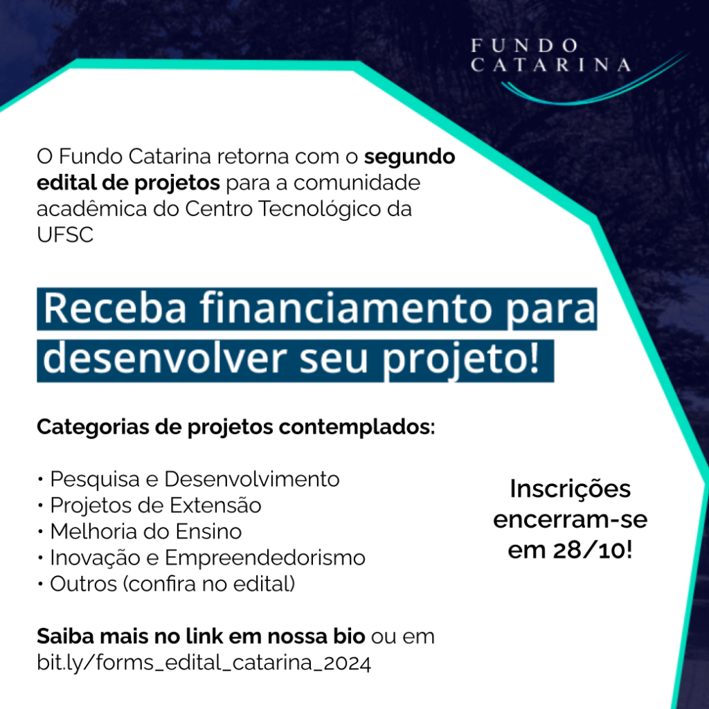 O Fundo Catarina, programa de financiamento de projetos de estudantes da Universidade Federal de Santa Catarina (UFSC), abriu o seu segundo edital de financiamento destinado a projetos de alunos da UFSC que contribuam de forma significativa para a sua formação acadêmica. O valor do financiamento pode chegar até R$ 35 mil, as inscrições vão até o dia 28.