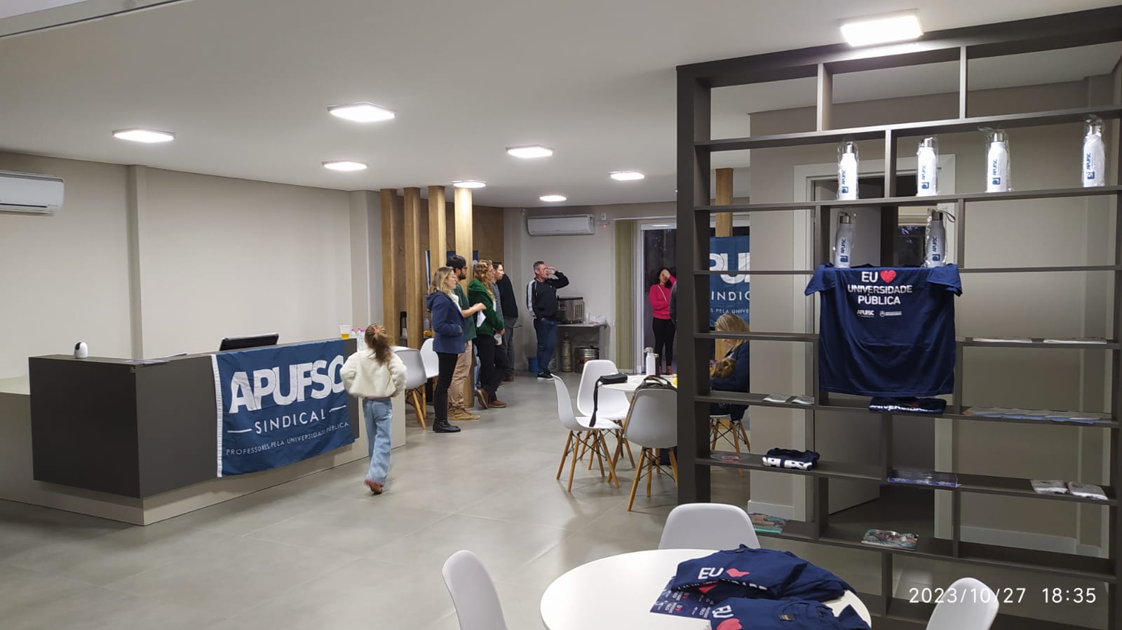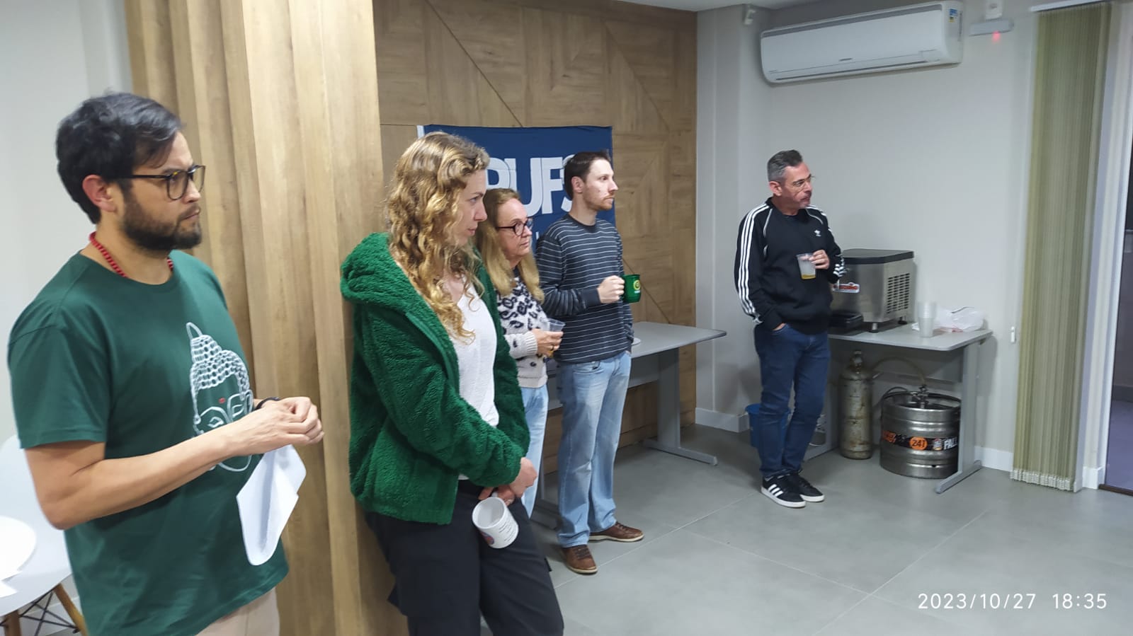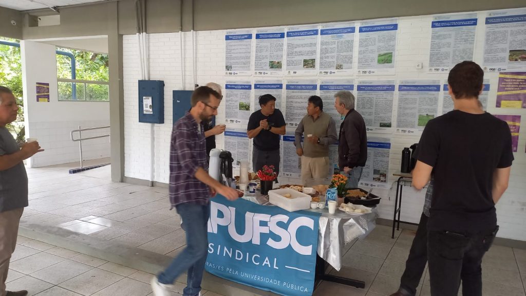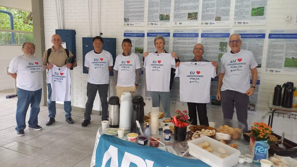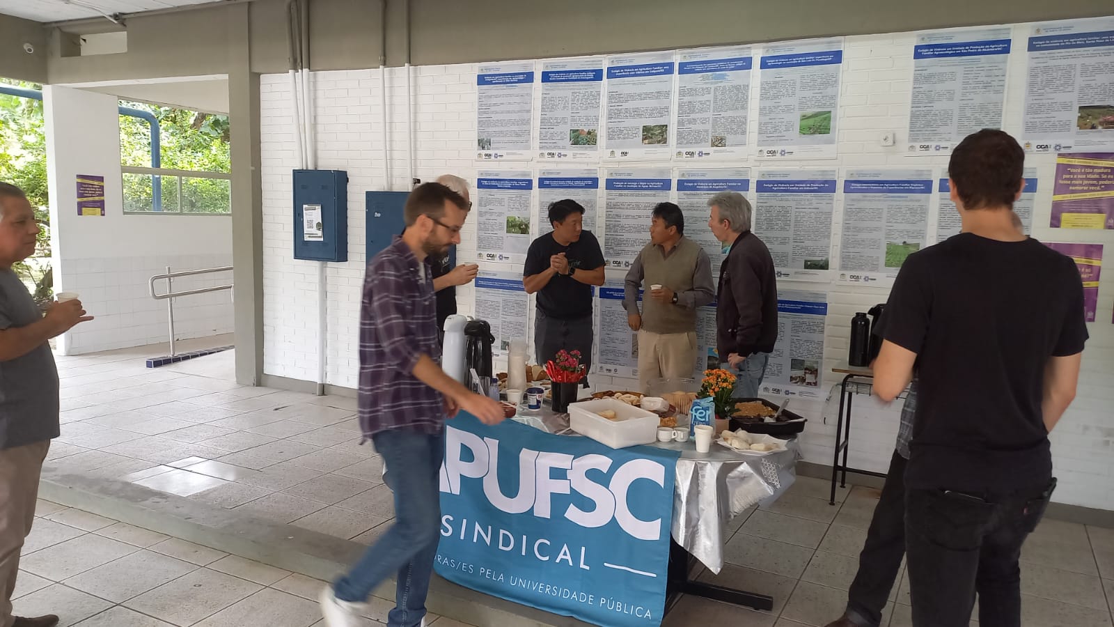 A programação continuou ao longo da semana passada. Na segunda-feira, dia 23, o café foi no hall do Centro de Ciências Agrárias (CCA); na terça, dia 24, no Centro de Ciências Biológicas (CCB); na quinta-feira, dia 26, foi a vez do Centro de Desportos (CDS); e na sexta-feira, dia 27, do Centro Tecnológico (CTC). A semana encerrou com comemoração na sede da Apufsc em Curitibanos, também na sexta.