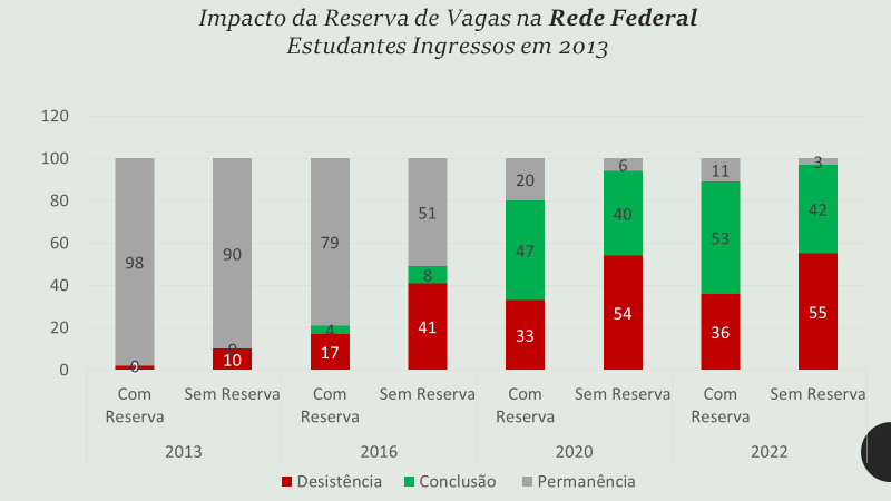 Observa-se que de cada 100 ingressantes do ano 2013, nos cursos de graduação da Rede Federal, somente 42 não-cotistas concluíram os seus estudos. Entre os beneficiários de algum tipo de reserva de vaga, no entanto, esse número sobe para 53, podendo chegar a 64, pois 11 cotistas ainda permanecem estudando. Nenhum dos casos pode ser declarado um inquestionável sucesso, mas, gostemos ou não, o que fica evidente é que os cotistas se formam mais, mais rápido e desistem menos do que os não cotistas, indicando que as políticas e programas de reserva de vagas nas instituições federais, entre eles a Lei das Cotas, o SISU e outras políticas institucionais localizadas, são importantes para o acesso dos grupos sociais historicamente excluídos da educação superior.