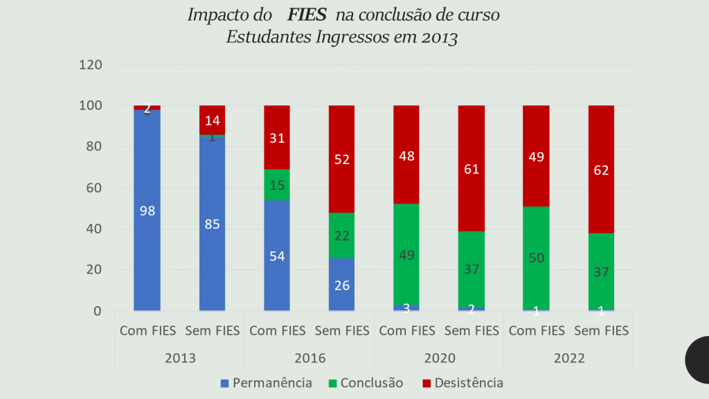 No setor privado não é diferente. O PROUNI e o agora quase extinto FIES — este com as suas matrículas reduzidas, em 2022, a 12,6% do que representavam em 2015 — são claramente programas de inclusão bem-sucedidos, apesar dos repetidos ataques que têm sofrido nos últimos anos. A trajetória dos estudantes com FIES, ingressantes em 2013, se comparada a dos estudantes sem FIES, no setor privado, não deixa dúvidas sobre o seu relativo sucesso, pois a sua taxa de diplomação também é significativamente mais alta que a dos demais. Ver gráfico abaixo:
