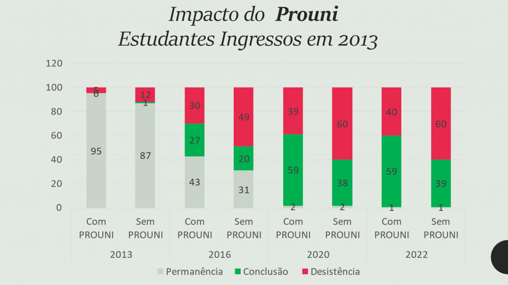 Constata-se que os PROUNIstas da Geração 2013 têm, em 2022, uma taxa de conclusão de 59%, 20 pontos percentuais acima da dos demais estudantes do setor privado. Ou seja, os PROUNIstas se formam mais, mais rápido e desistem bem menos que os seus colegas do setor privado.